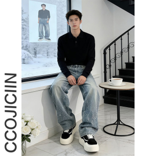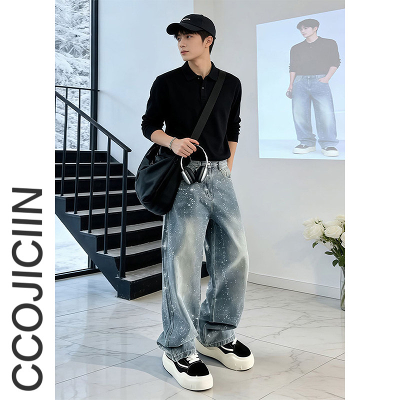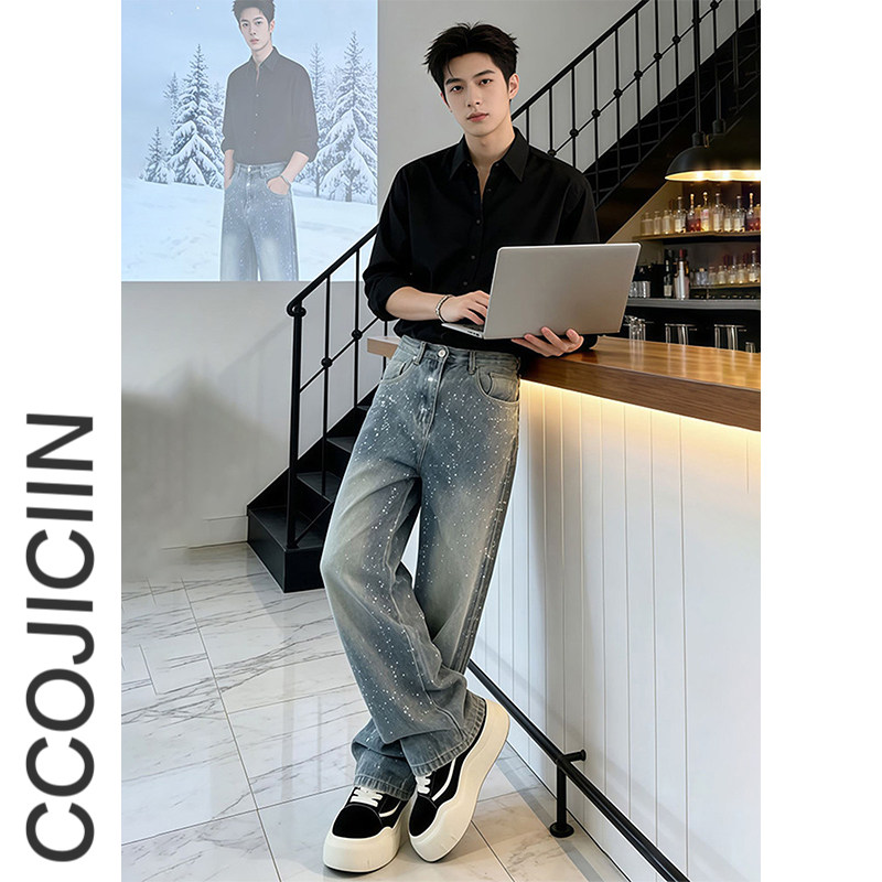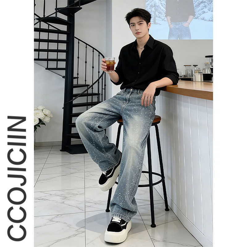 子潮牌痞帅炸街微喇裤 男满天星直筒阔腿弯刀裤 高街烫钻牛仔裤 美式