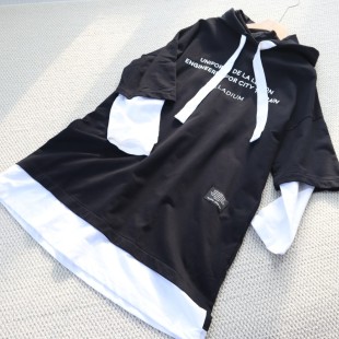 设计字母印花黑色连帽卫衣帽衫 假两件卫衣女个性 外套 长款 外贸春季