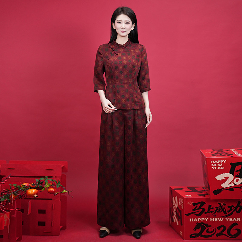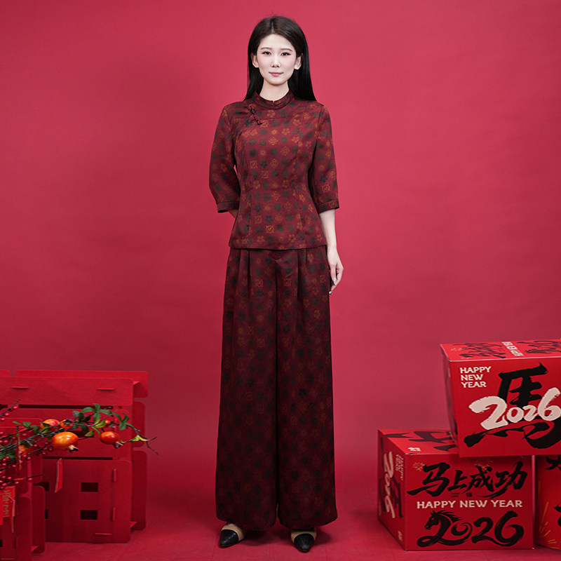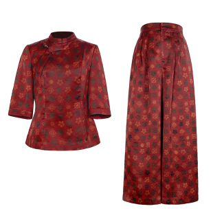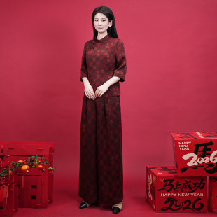 夏季 浒城古娘新款 女装 国风两件套装 桑蚕丝印花气质立领红色新中式