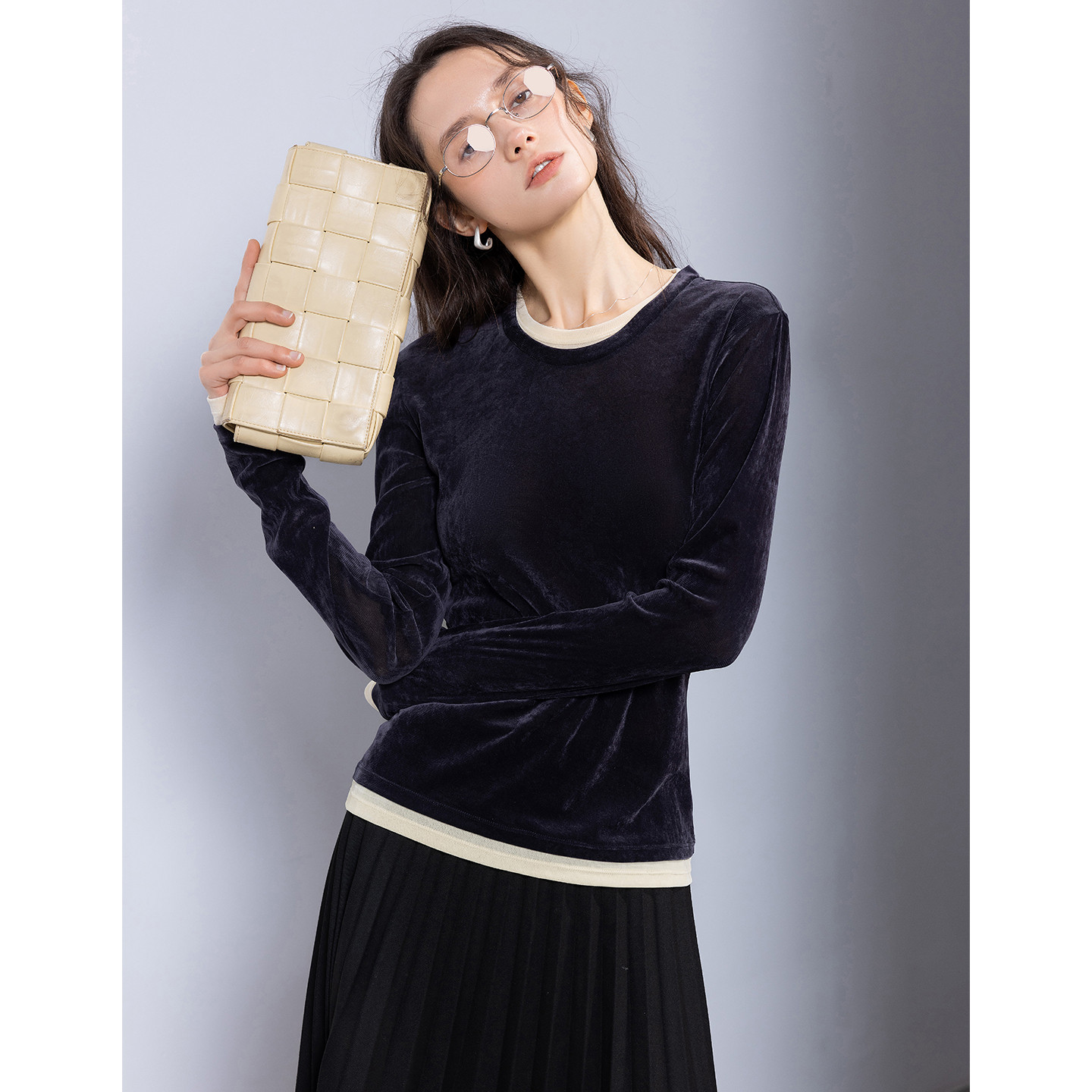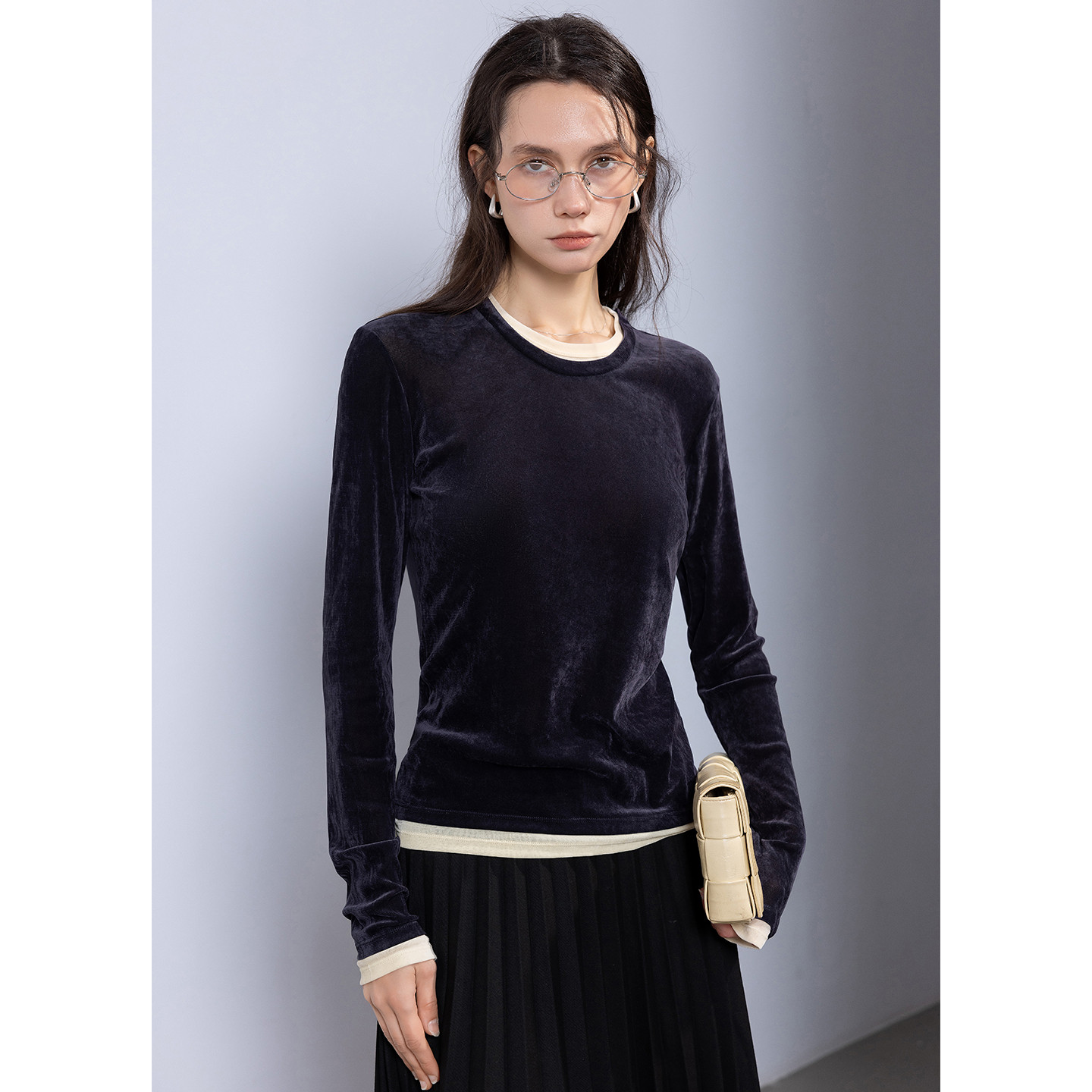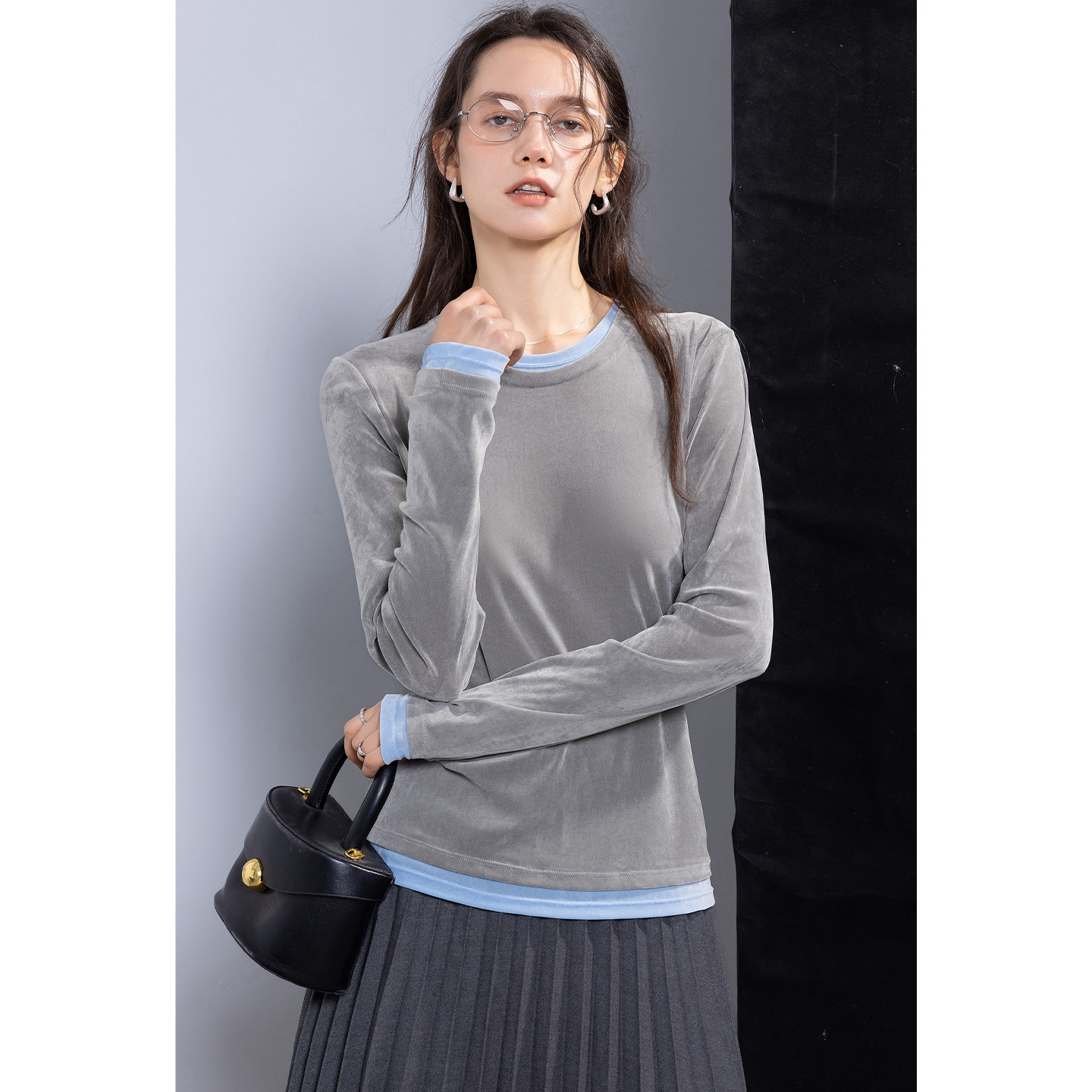 显瘦叠穿拼接假两件上衣长袖 丝绒打底衫 修身 春季 t恤 女士2026新款