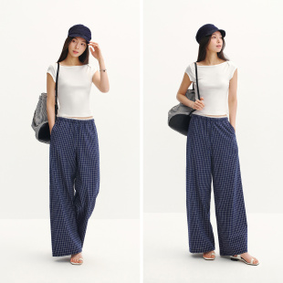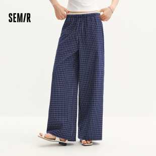 文艺慵懒温柔阔腿裤 2026新款 女夏盐缩格子肌理花边长裤 森马休闲裤