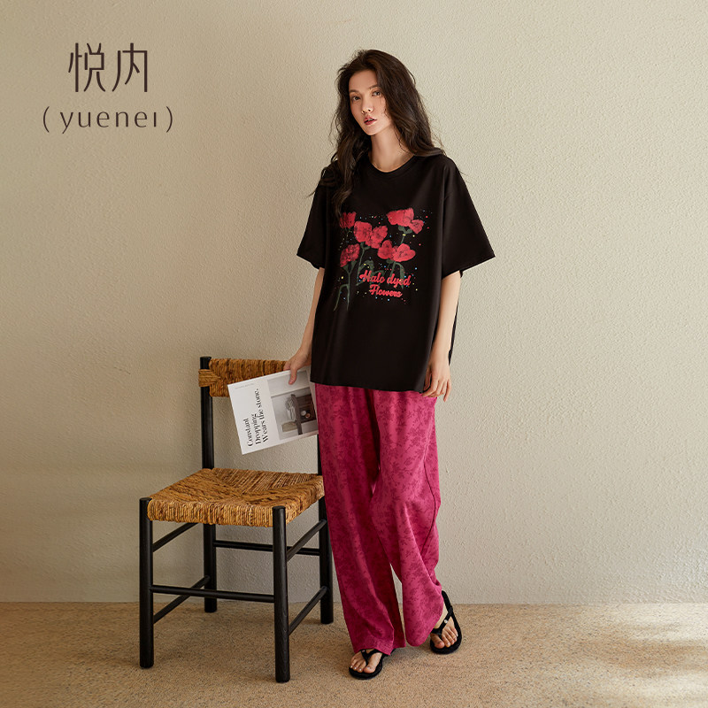 家居服时尚 长裤 宽松休闲玫瑰高级感 夏天纯棉短袖 悦内睡衣女士夏季
