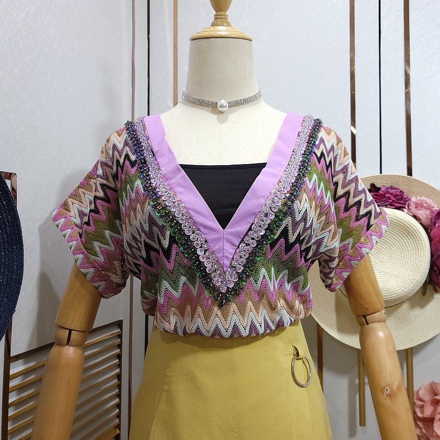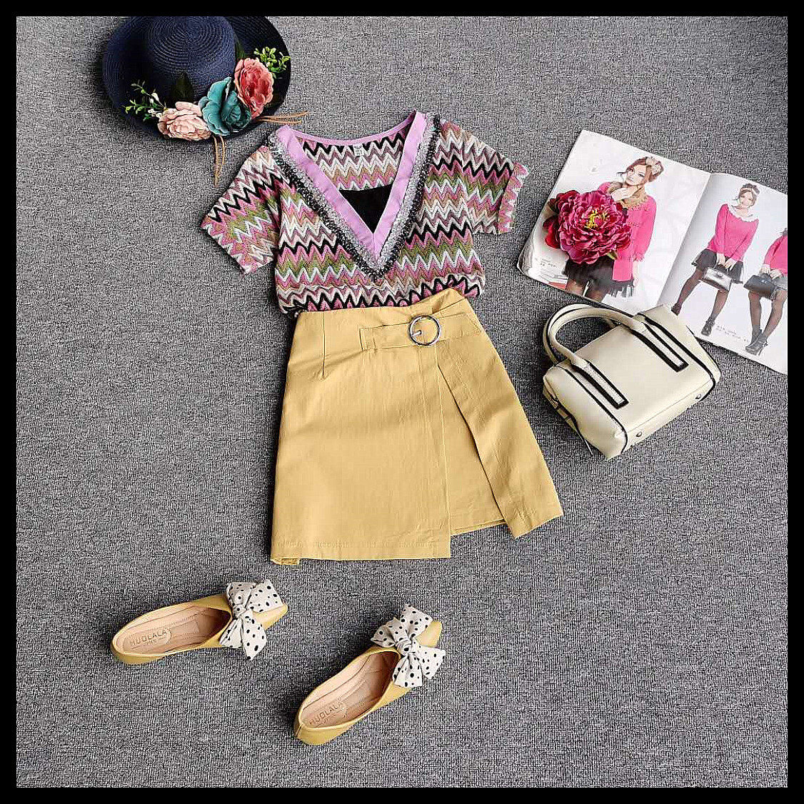 2023年亮片V领上衣 A字半身裙短裙显瘦两件套套裙女夏