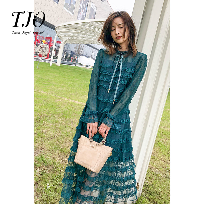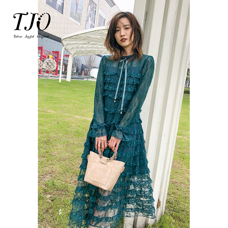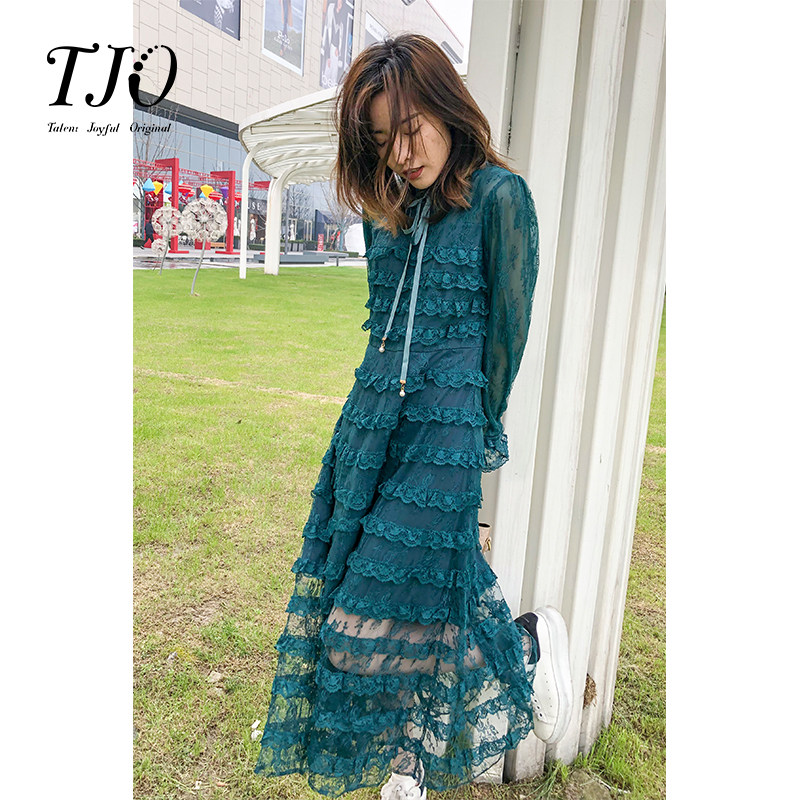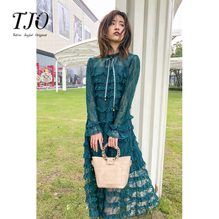 孔雀绿气质蕾丝面纱长袖 夏季 连衣裙女收腰薄款 2020中长款 裙 新款