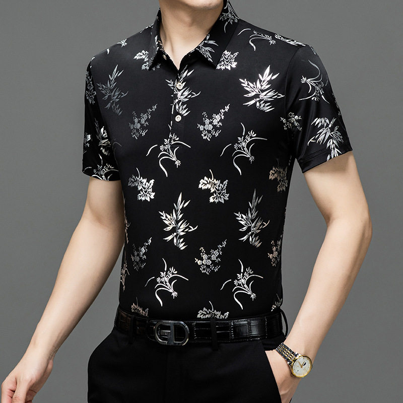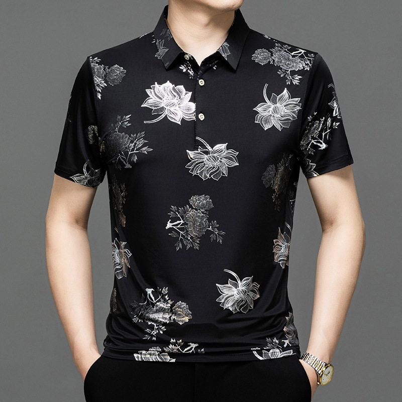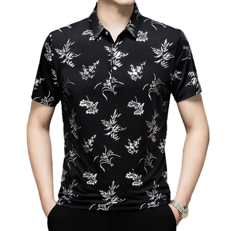 新款 冰丝翻领碎花中年休闲冰感薄款 男士 polo衫 上衣潮 短袖 2024夏季