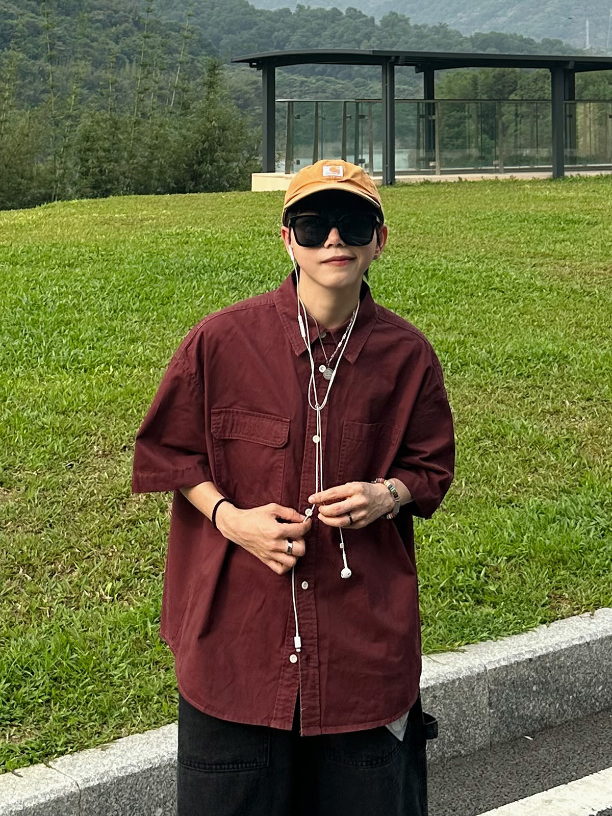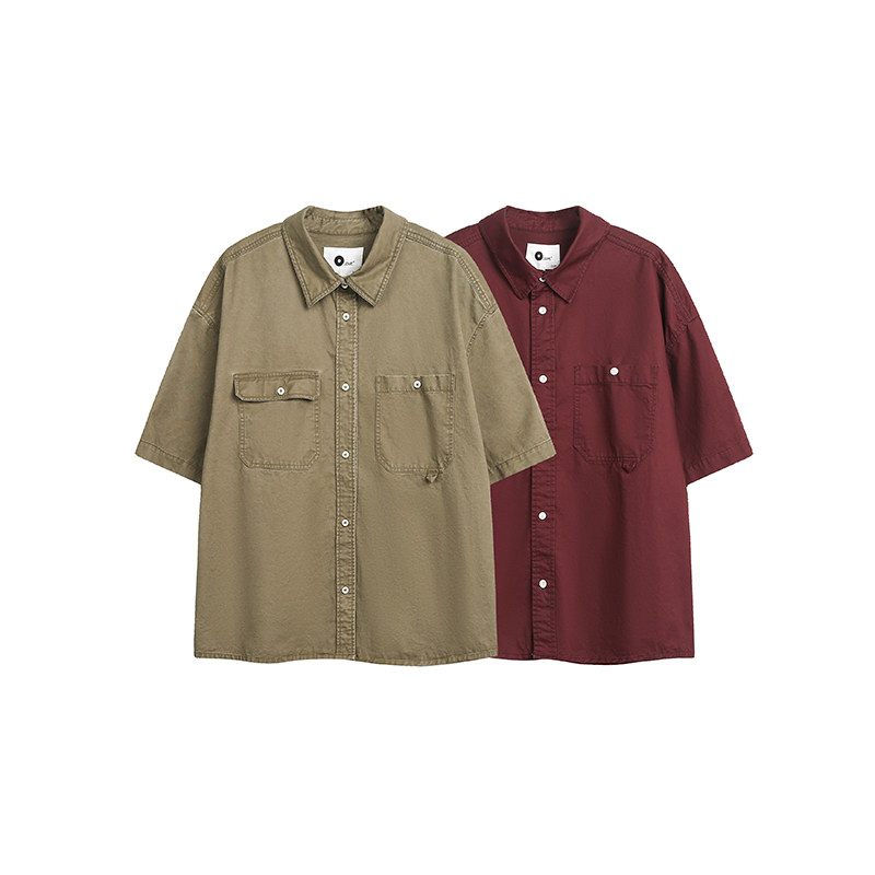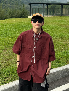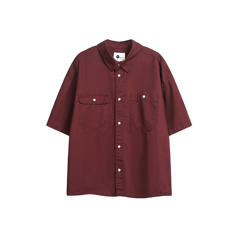 短袖 XBRO复古无性别口袋工装 衬衫 酒红色洗水做旧五分袖 衬衣男 夏季