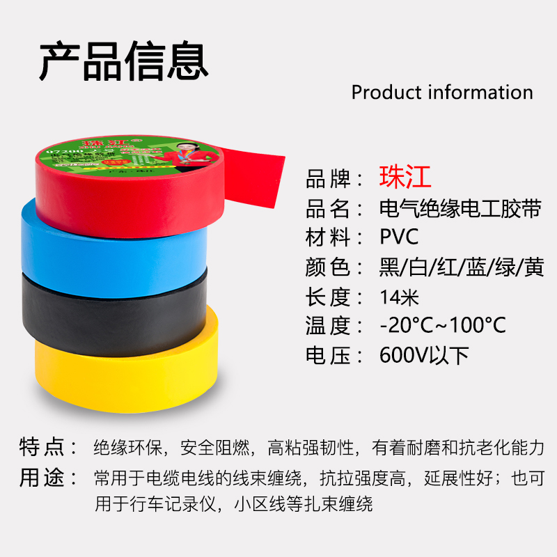 珠江牌电工胶带7200型耐磨阻燃电气家装 绝缘PVC防水防火大号胶布