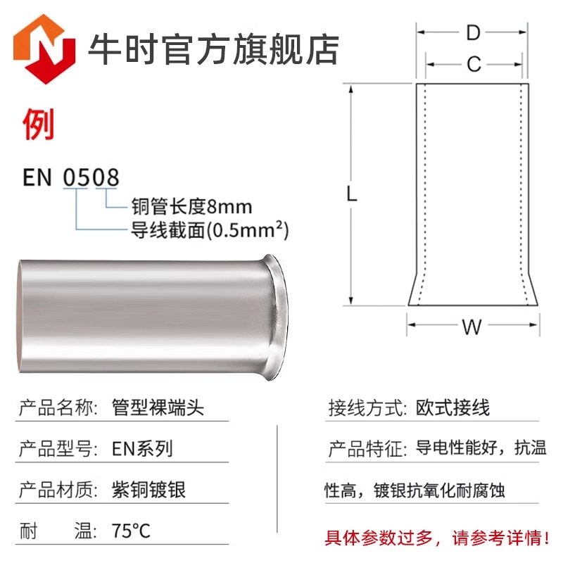 EN紫铜管型端子插针线鼻冷压接线铜接头针型铜镀银接线柱裸管端头