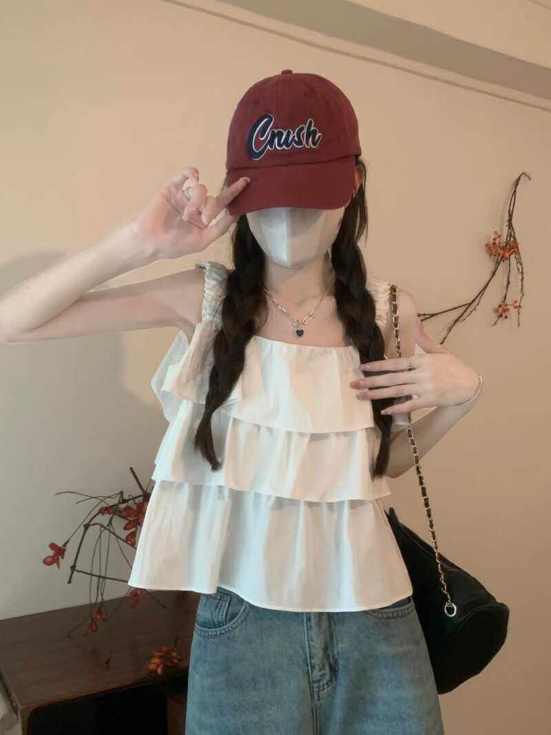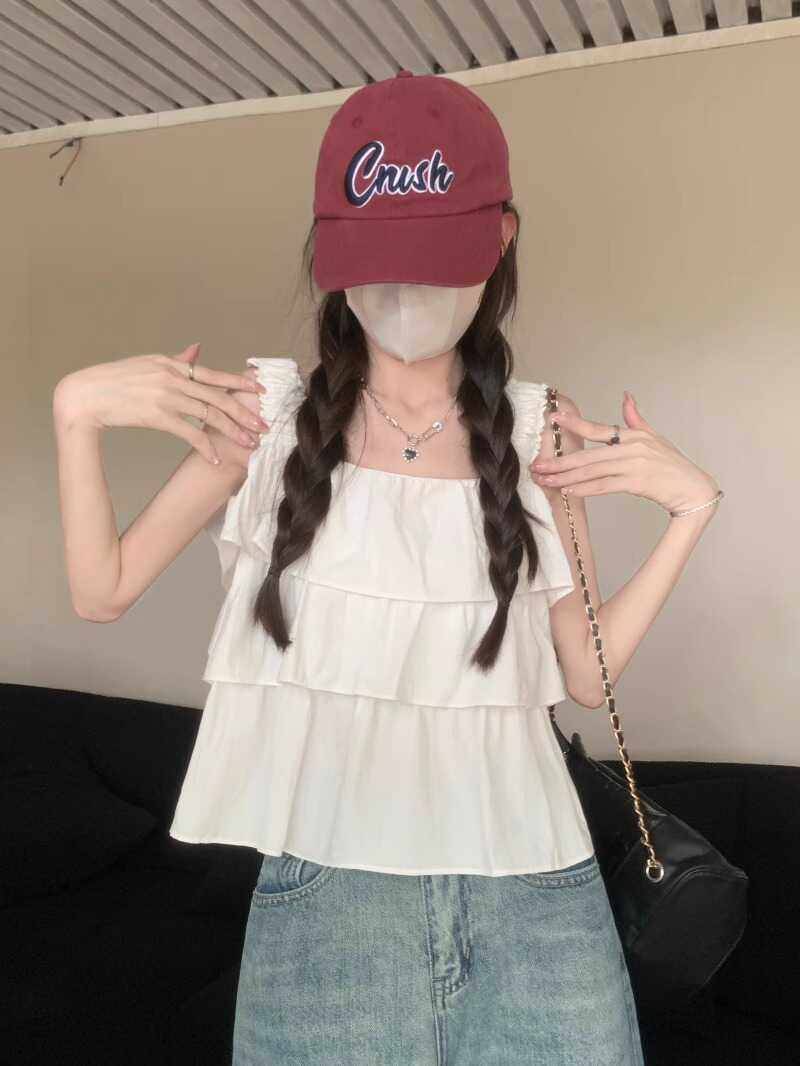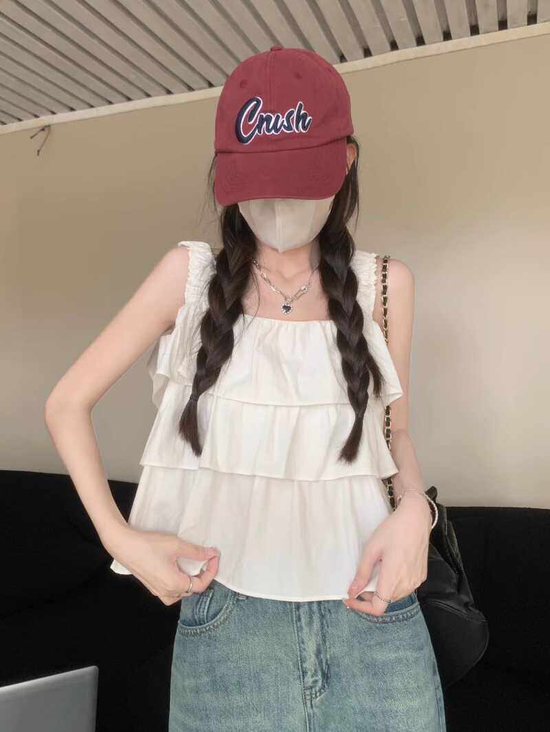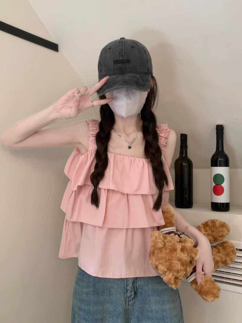 粉色多巴胺吊带背心女夏遮副乳亮色小个子外穿泰式 上衣 蛋糕娃娃衫