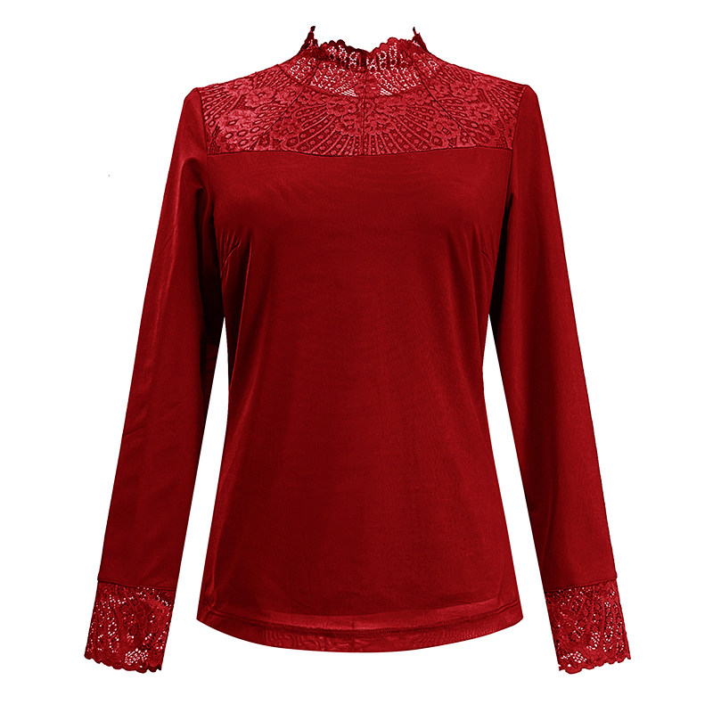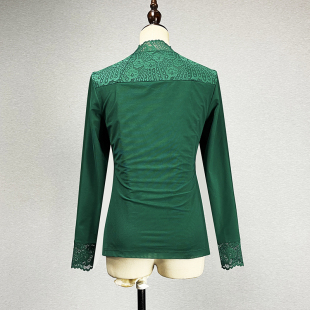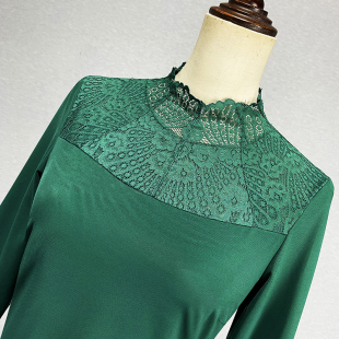 显瘦镂空立领酒红色保暖打底衫 2024弹力修身 蕾丝衫 绿色加绒九分袖