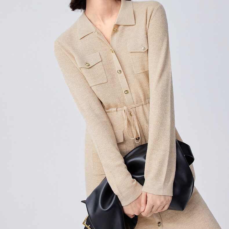 伊芙丽2024秋装 设计感系带休闲连衣裙1EA393371 新款