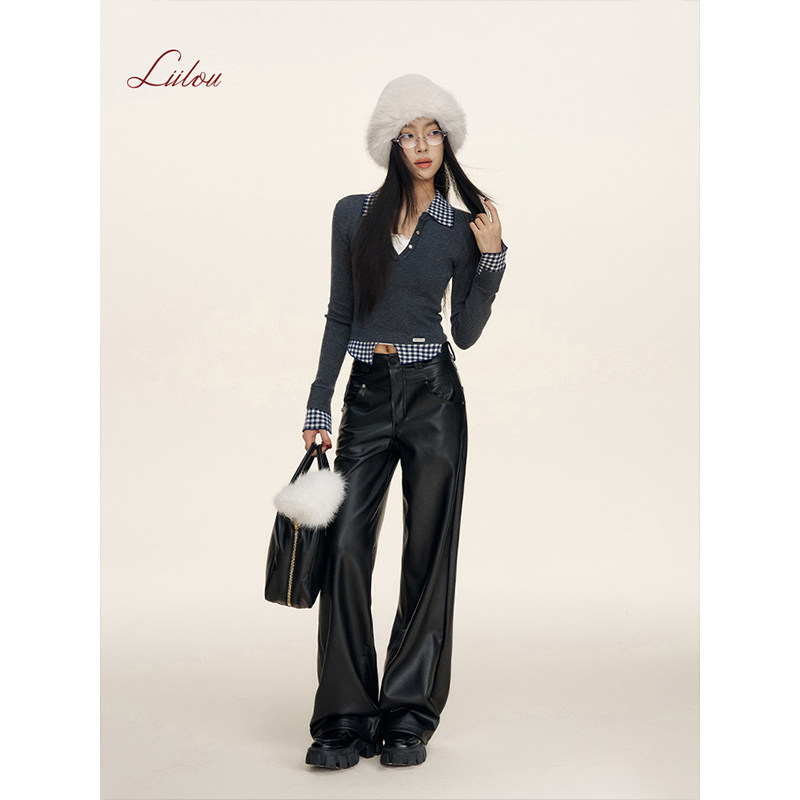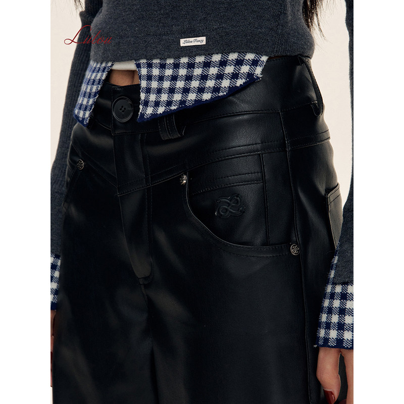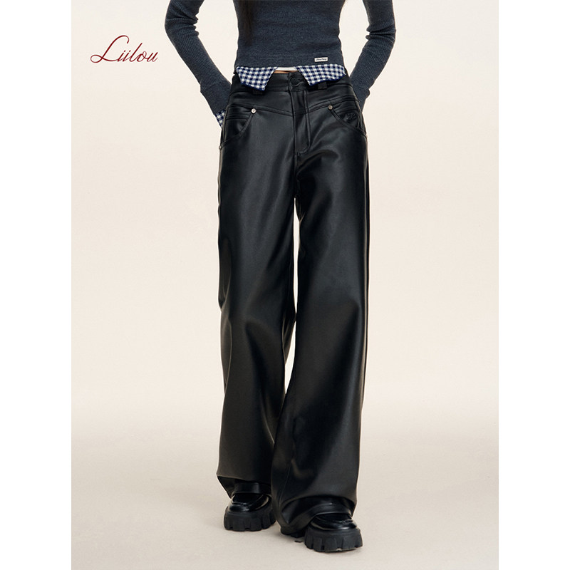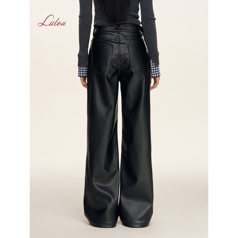 Athflow 式 垂感皮质 秋冬款 加厚高腰宽松阔腿纯黑直筒皮裤 Liilou