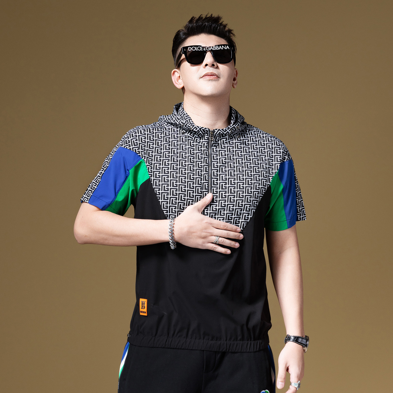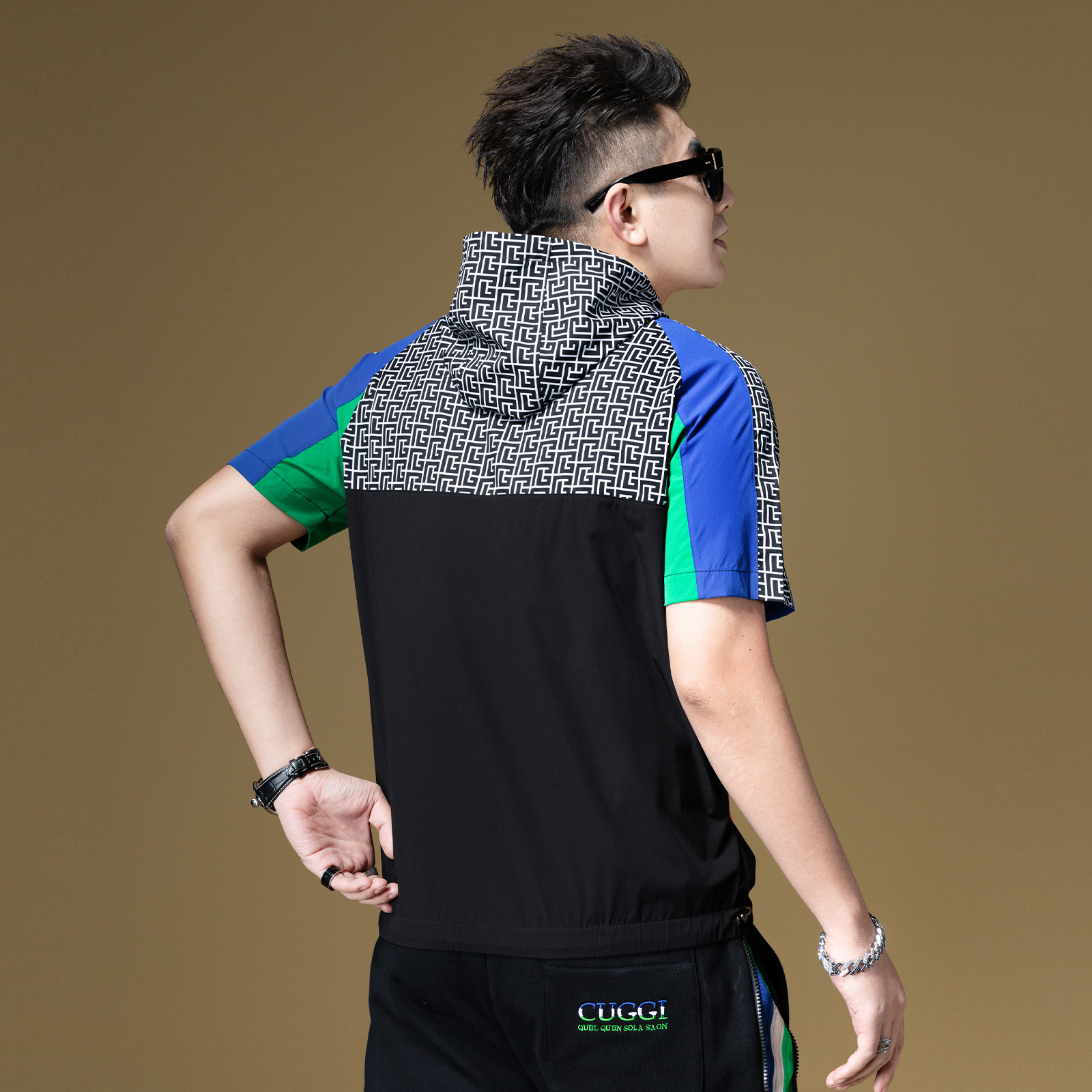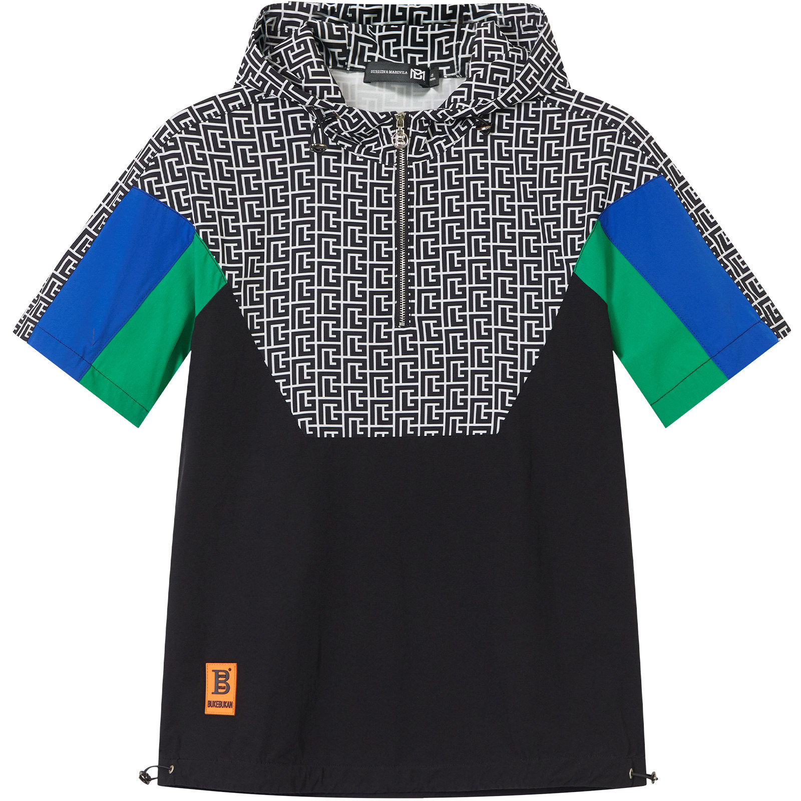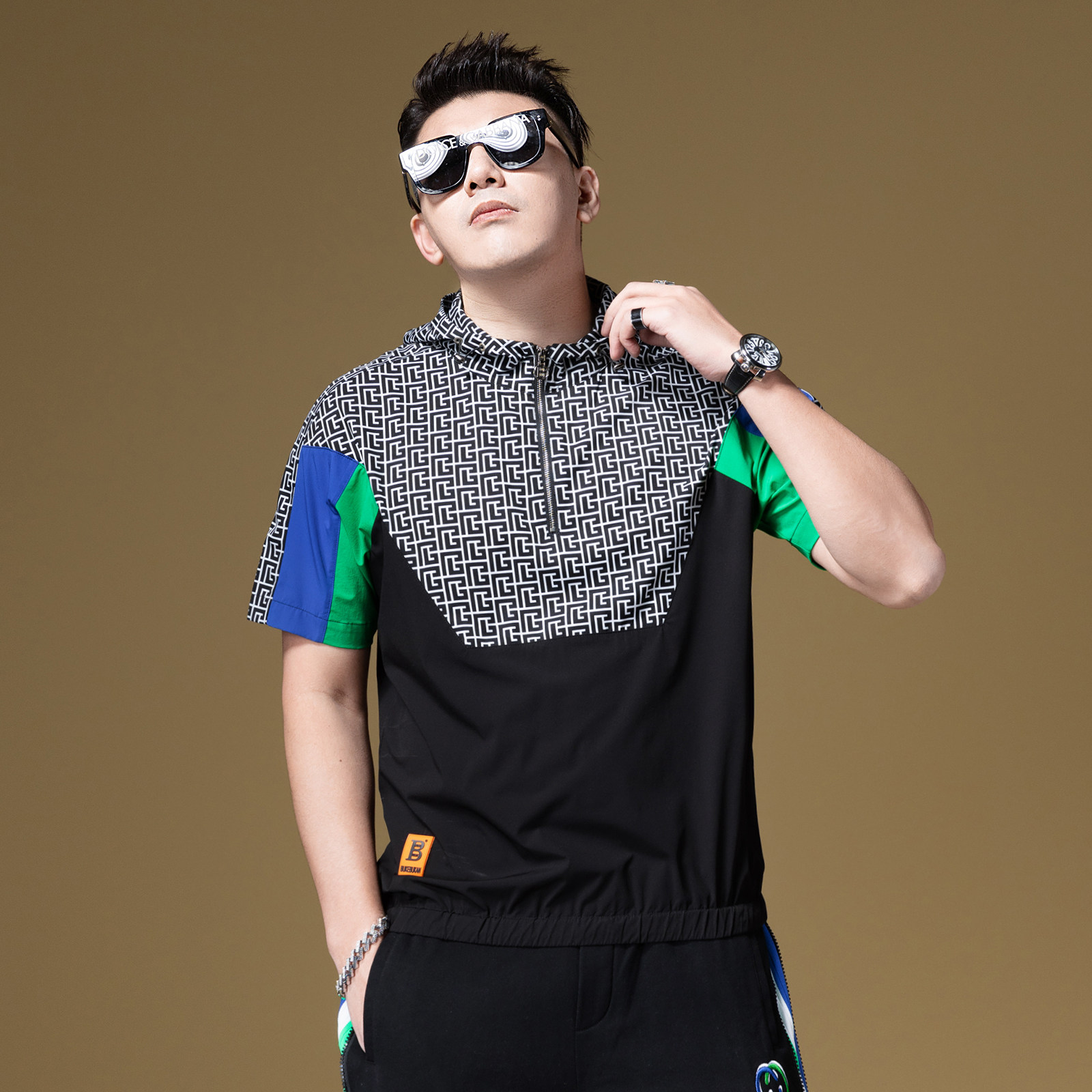 体恤2023新款 高街t恤男潮牌撞色拼接男士 夏 美式 BM半拉链连帽短袖