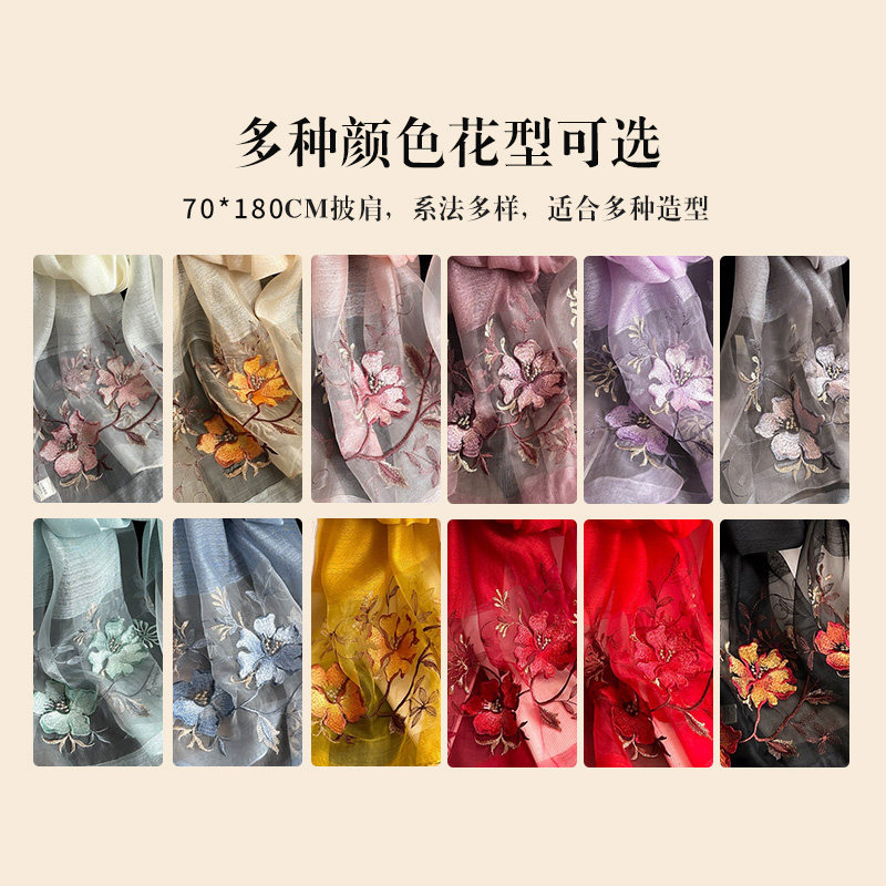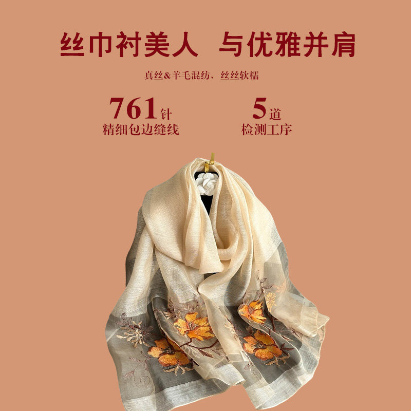 恒源祥新款 春秋优雅刺绣桑蚕丝羊毛丝巾女出行百搭旗袍披肩围巾薄