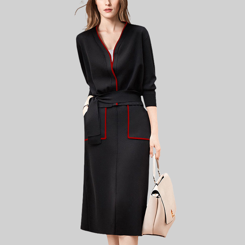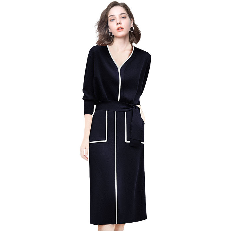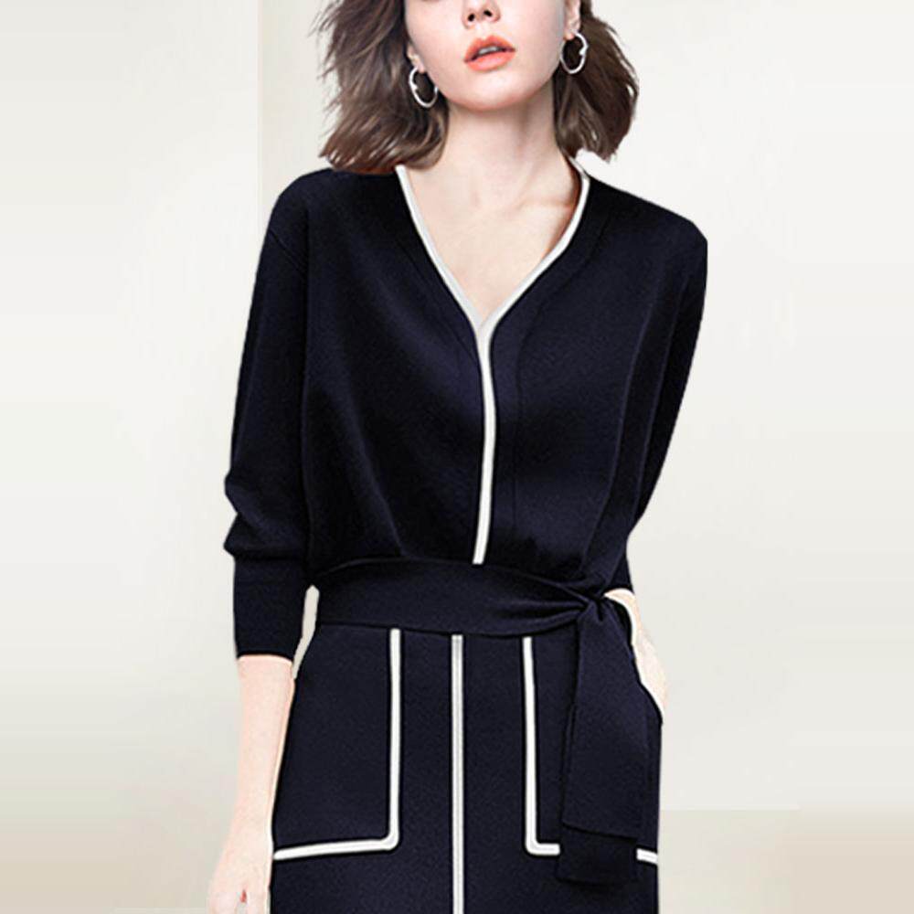 设计感撞色V领连衣裙女2026年春季 设计感宽松简约收腰一字裙 新款
