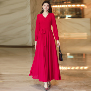 2025春秋冬纯色大红色连衣裙收腰显瘦长裙妈妈款 小个子沙滩裙 短款