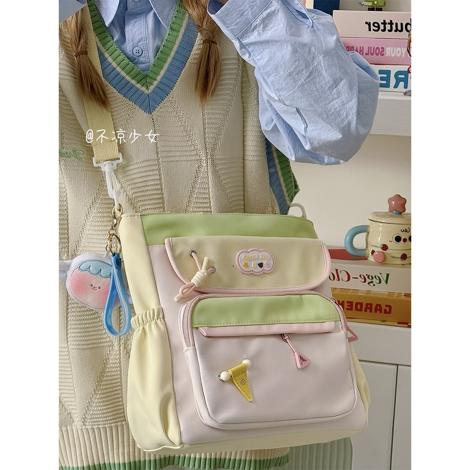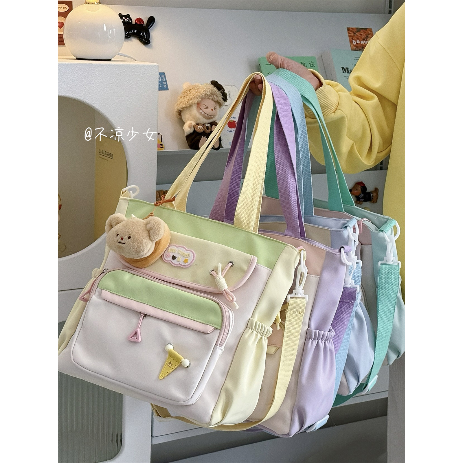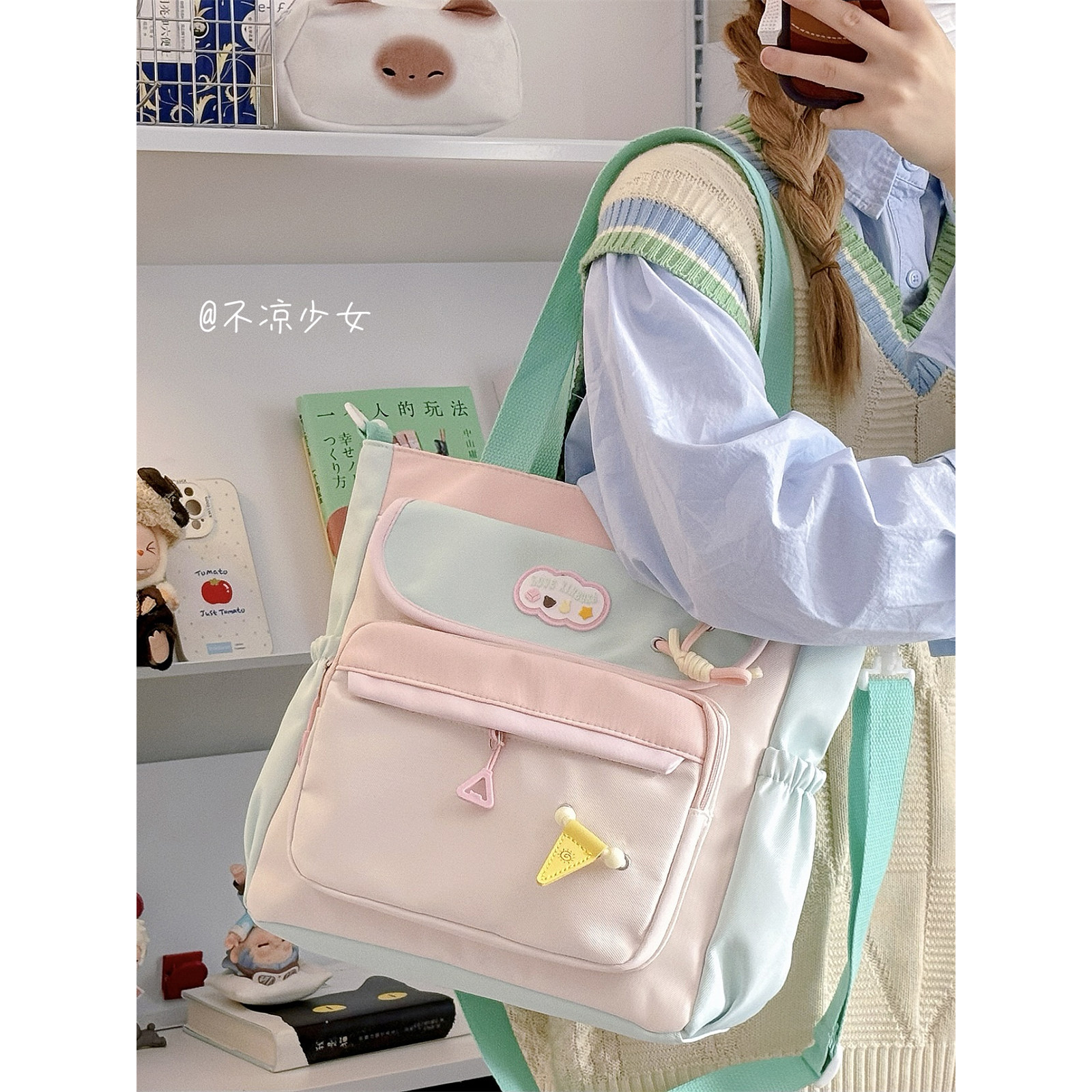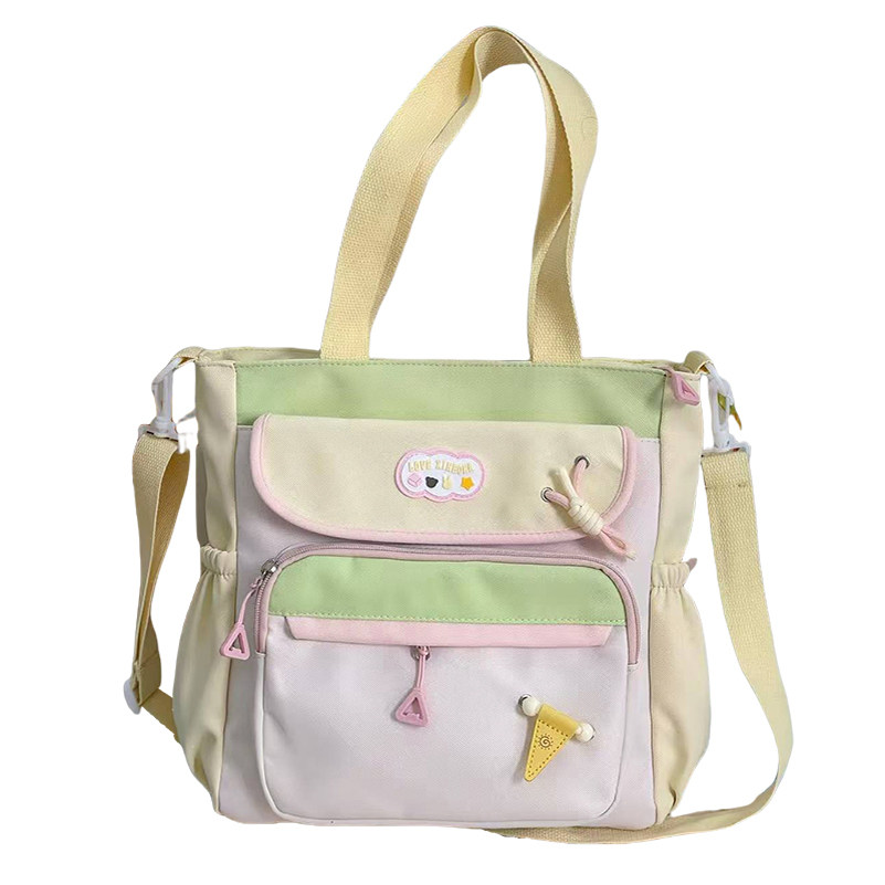 可爱小清新森系托特包撞色大容量单肩斜挎包女学生上课补课通勤包