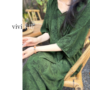 家居人造棉加长连衣裙 棉绸复古蝴蝶印花中袖 新中式 国风睡裙女夏季