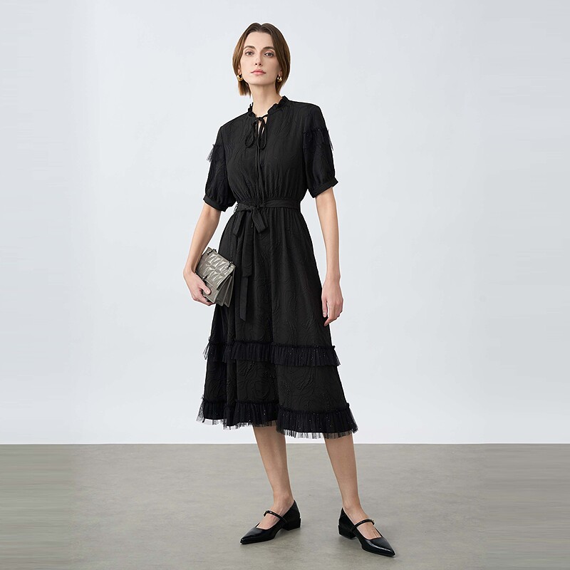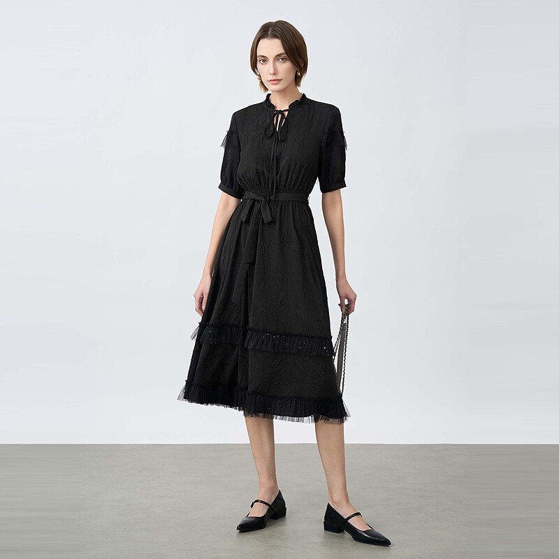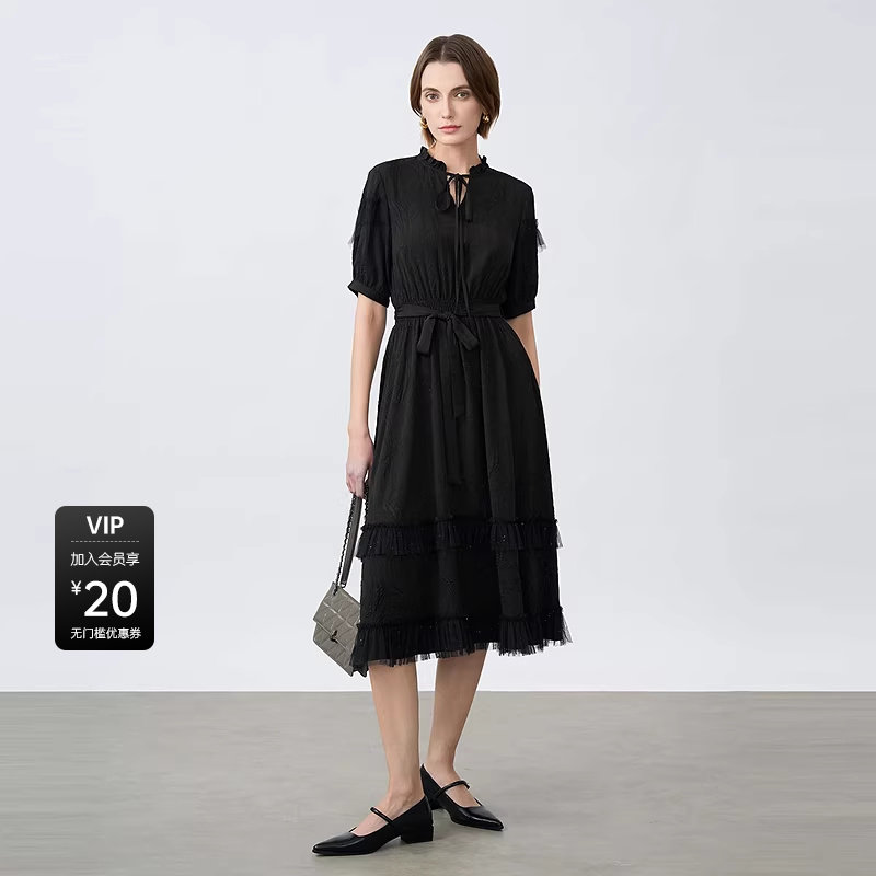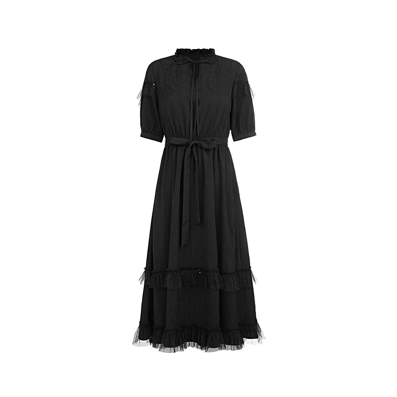 木耳边圆领收腰网纱短袖 女装 连衣裙S25261208 夏装 sdeer圣迪奥女装