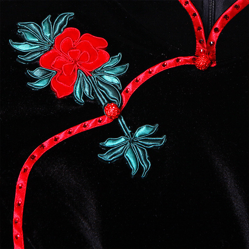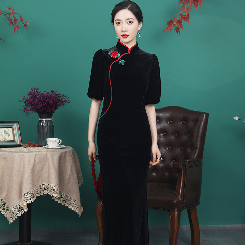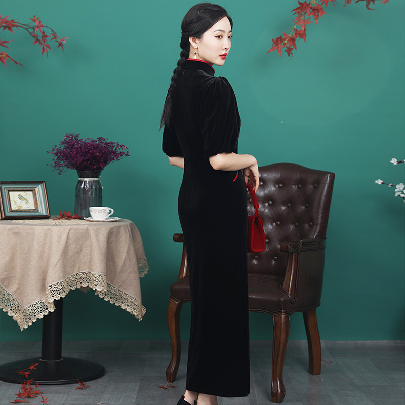 长款 中袖 丝绒连衣裙日常改良崔万志旗袍裙 春秋款 蝶恋月弥静