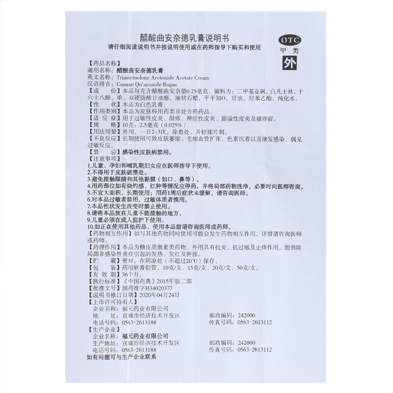 2.5mg 10g 1支 盒 福元 湿疹脂溢性皮炎 醋酸曲安奈德乳膏