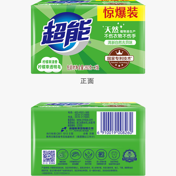2祛味不伤手洗衣皂家用清洗肥皂 透明皂柠檬草香味260g 超能