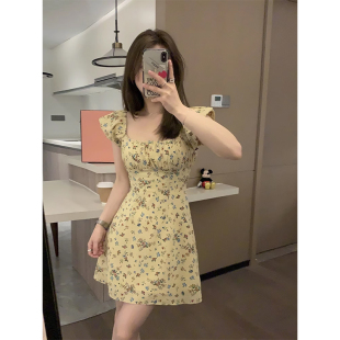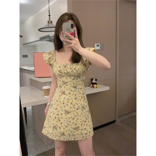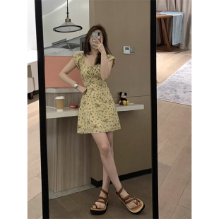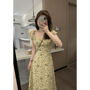 气质温柔碎花长款 Veee 方领小飞袖 显瘦显高法式 连衣裙 樱草黄夏花