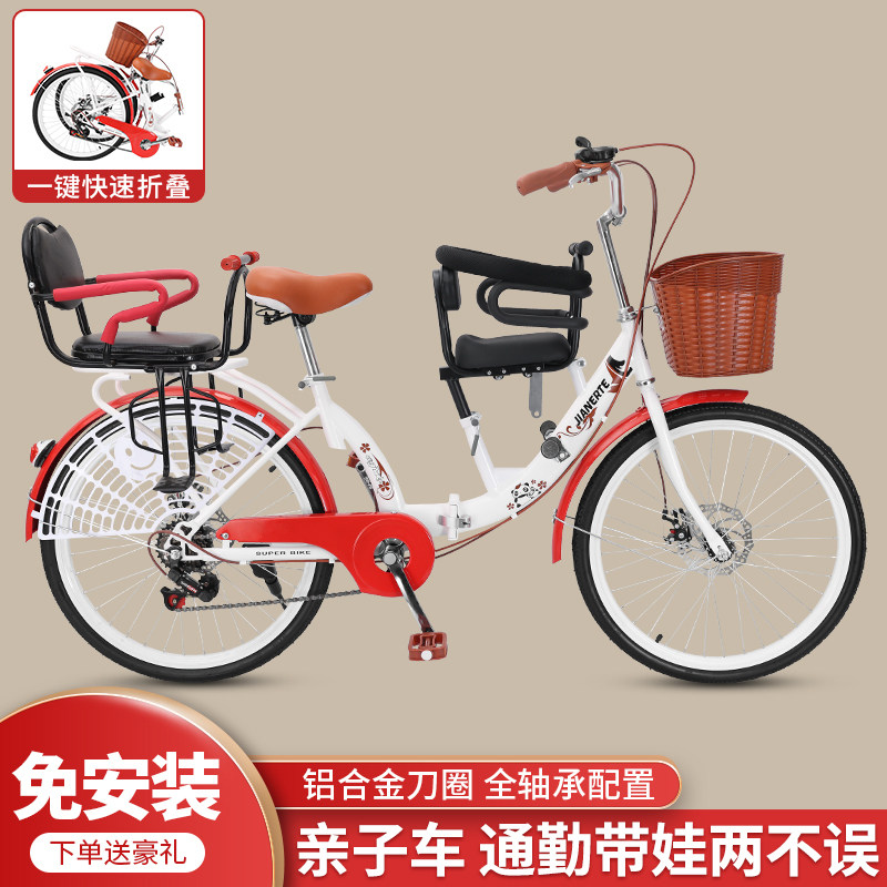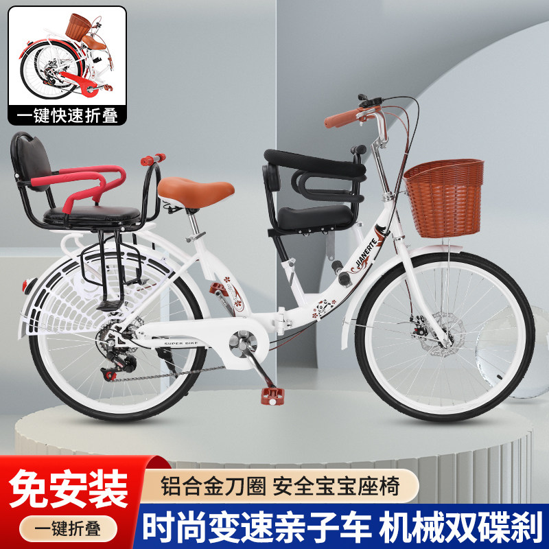 女式 自行车母子带娃接送孩子带小孩带儿童座椅单车 碟刹折叠亲子款