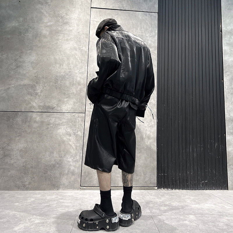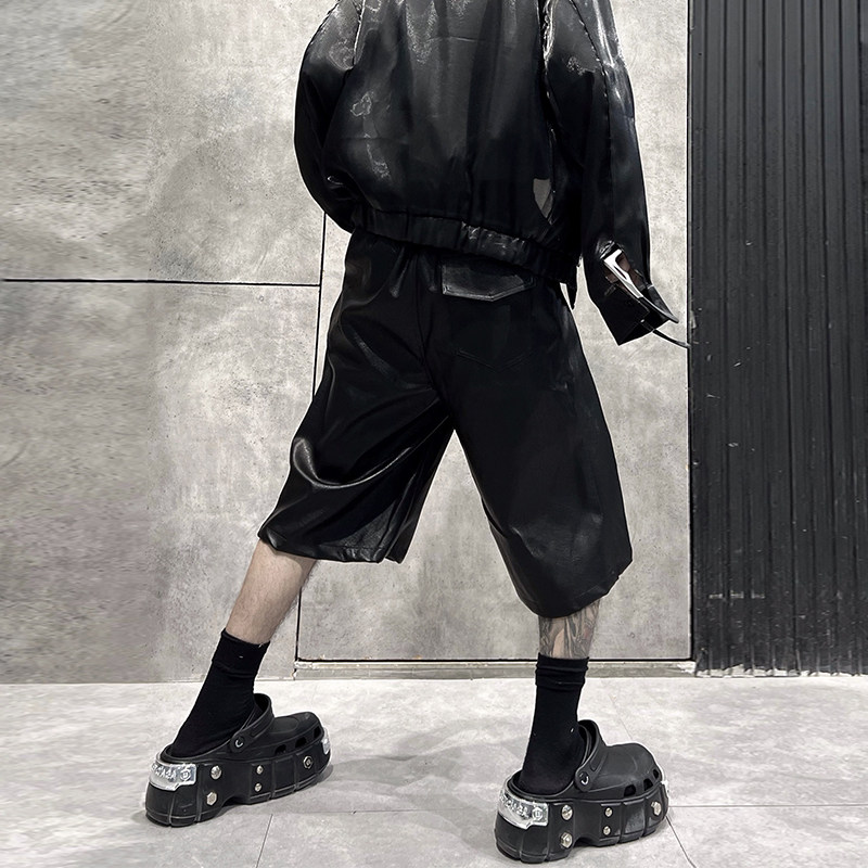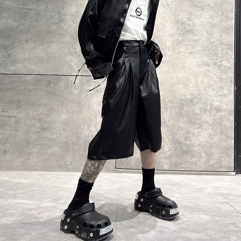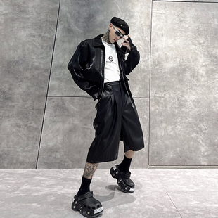 潮流中裤 牧羊帅 pu皮裤 男痞帅休闲五分裤 小众设计感褶皱阔腿短裤