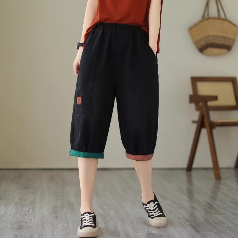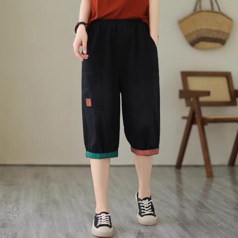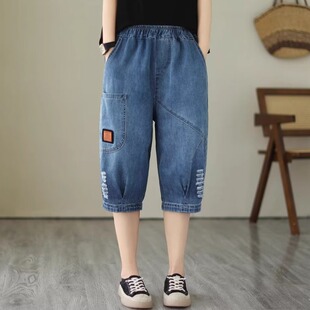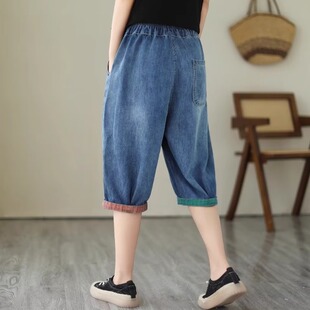 宽松显瘦松紧腰拼接哈伦裤 夏季 女小个子大码 休闲七分牛仔裤 子 薄款
