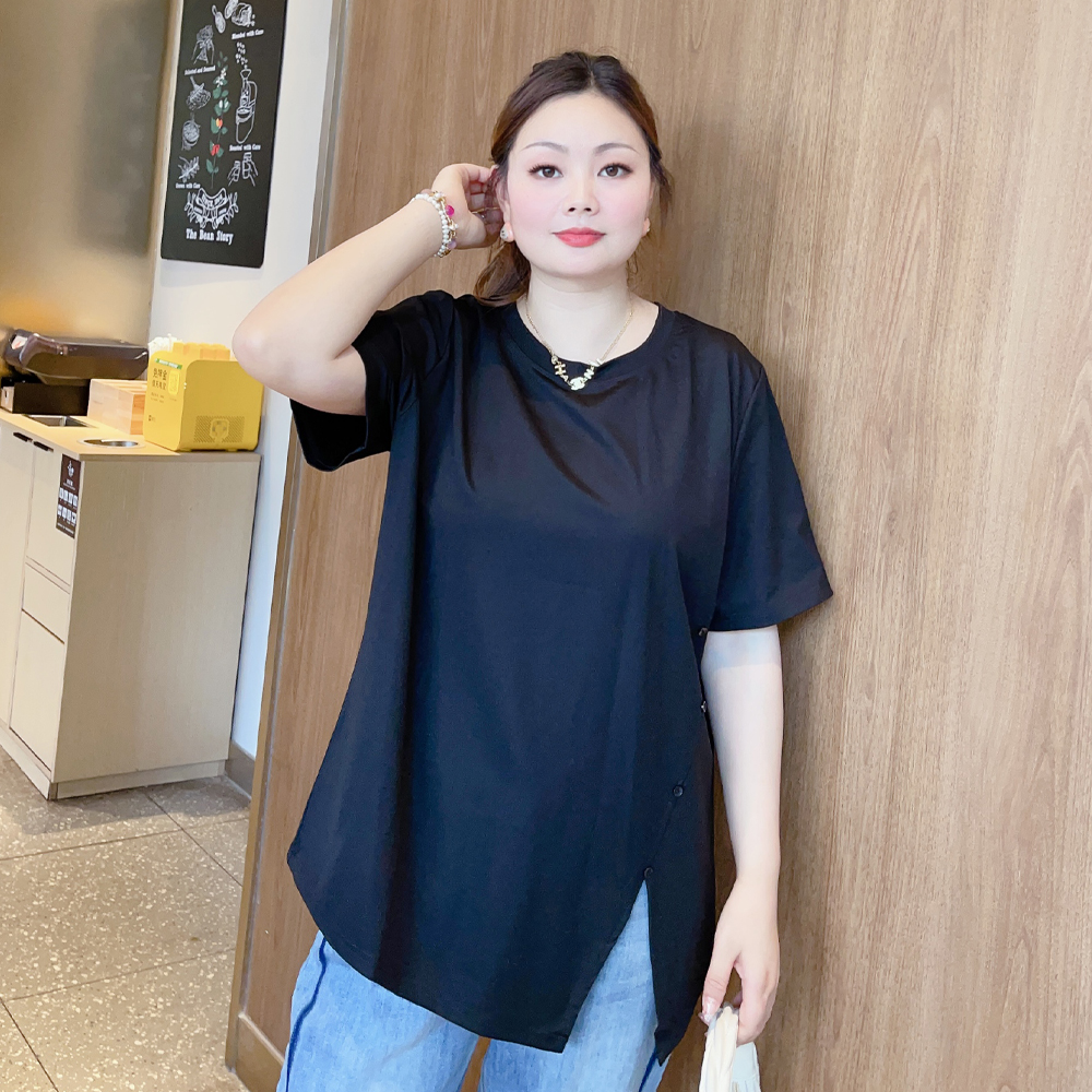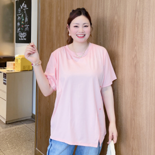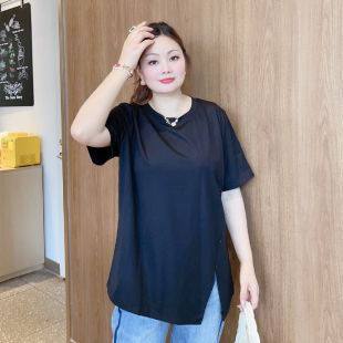 胖mm320斤时尚 2023夏装 洋气侧边开叉宽松T恤DF 女装 甜觅特大码