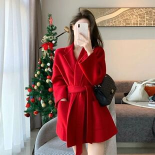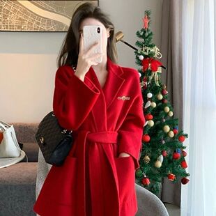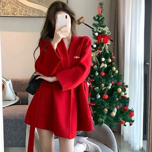 圣诞节高级感气质新年红色毛呢大衣加厚2023新款 呢子外套女 中长款
