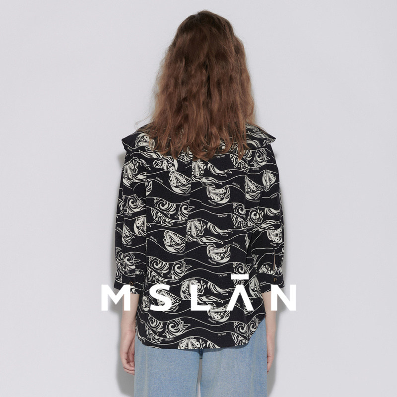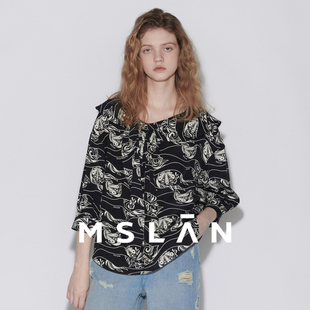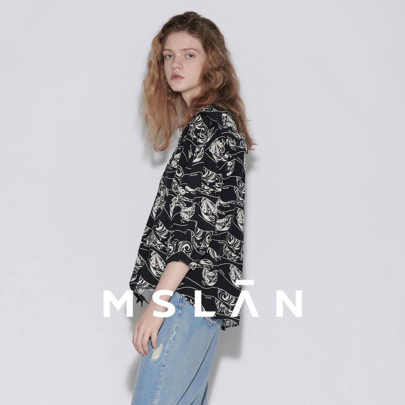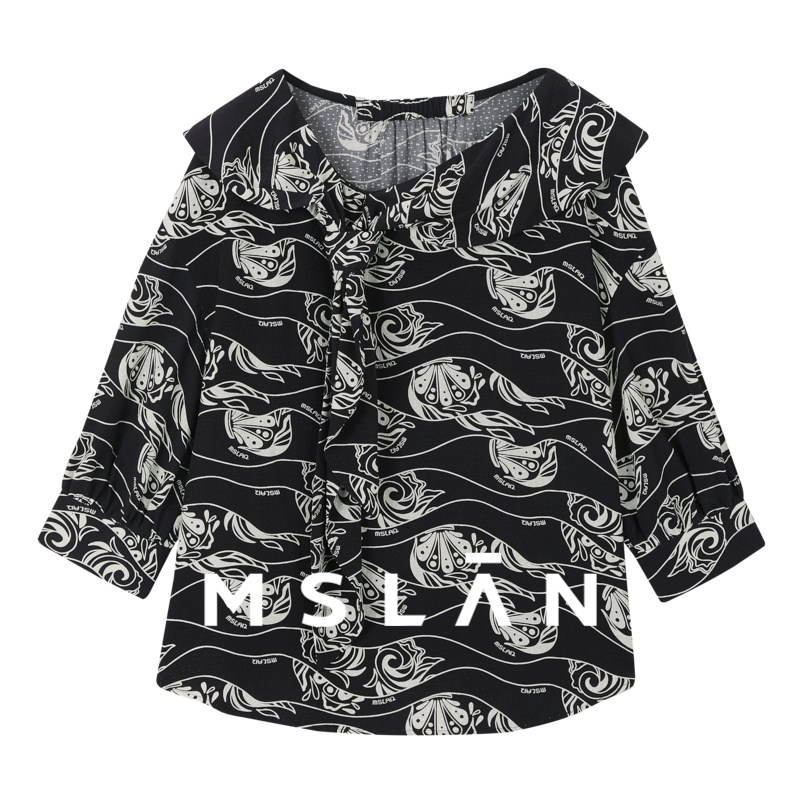 印花绑结设计衬衫 时髦黑白长袖 MSLAN春季 MEBA1518 宽松包容