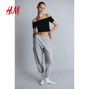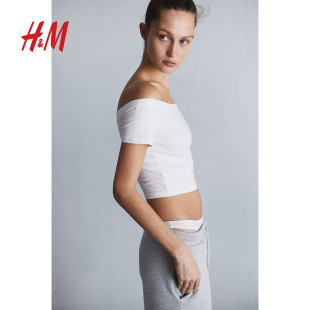 短款 HM女装 柔软棉质短袖 性感露肩修身 上衣1214113 T恤春季