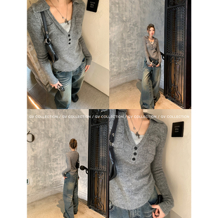 女内搭 撞色polo翻领针织上衣慵懒风百搭小衫 GV大白哥 简约都市