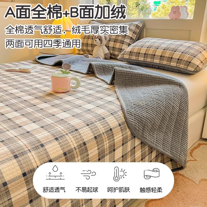 纯棉牛奶绒床盖一面绒一面棉毯加厚床单绗缝全棉加绒夹棉双面可用