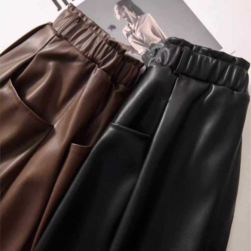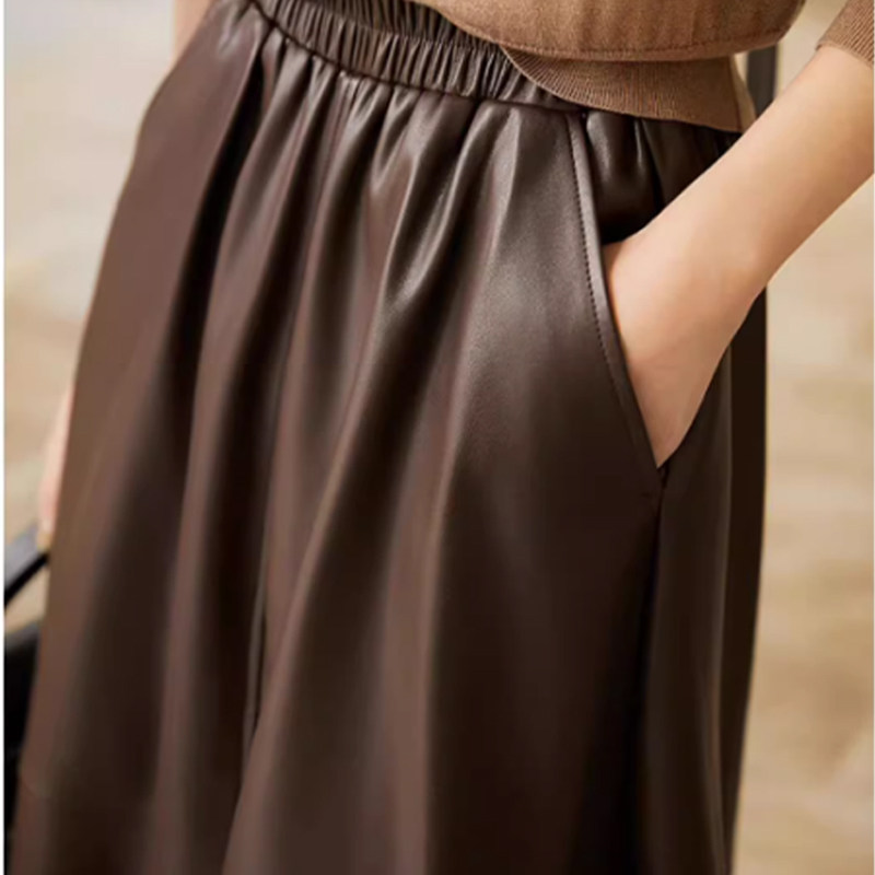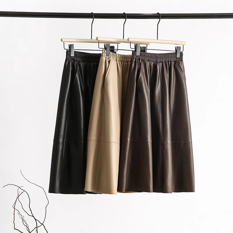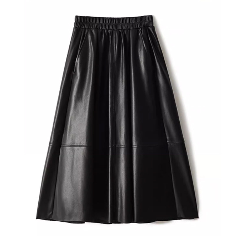 欧洲站春秋新款 伞裙 高腰绵羊皮皮裙真皮皮裙气质荷包半裙中长款