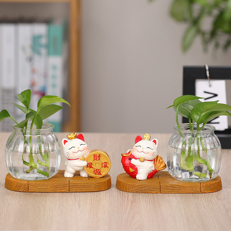 办公桌面摆件创意招财猫水培客厅餐厅店铺开业前台装 饰玻璃花瓶新