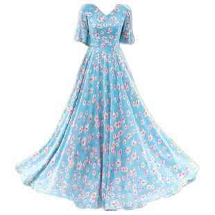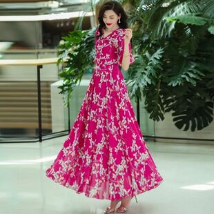 气质V领显瘦度假沙滩长裙 大摆碎花雪纺连衣裙女高腰大码 夏季 新款