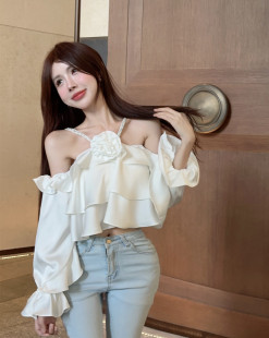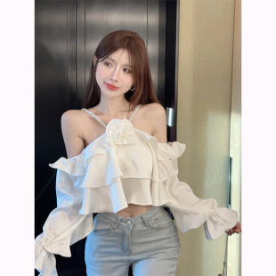 上衣女早秋 露肩衬衫 法式 甜美小众立体挂脖砖链设计感别致吊带长袖