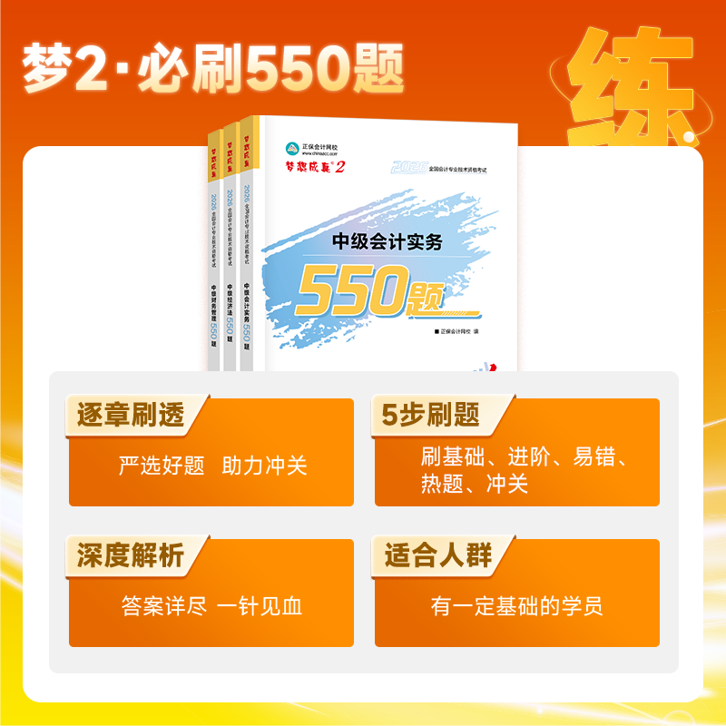 官方预售 正保会计网校中级会计2026教材考试梦2必刷550题中级会计实务财务管理经济法历年真题冲刺刷题练习题库试题图书