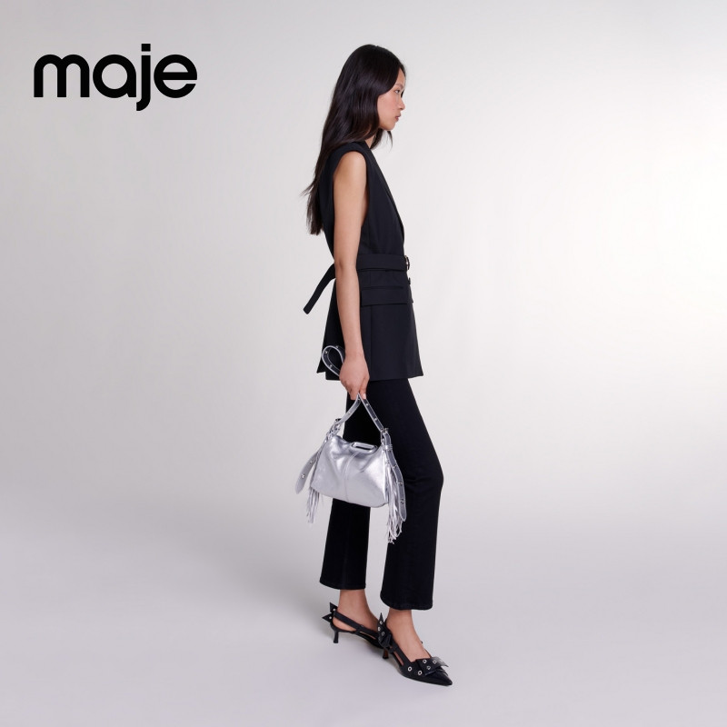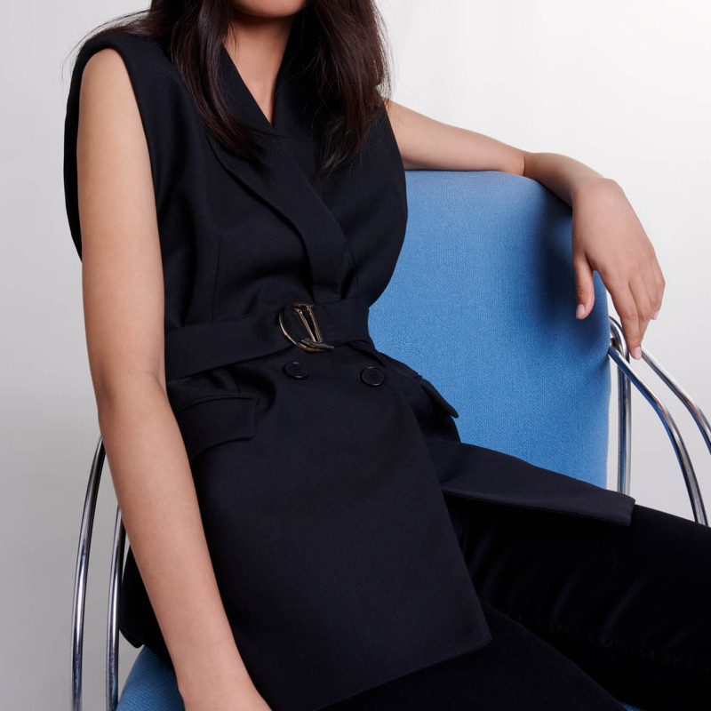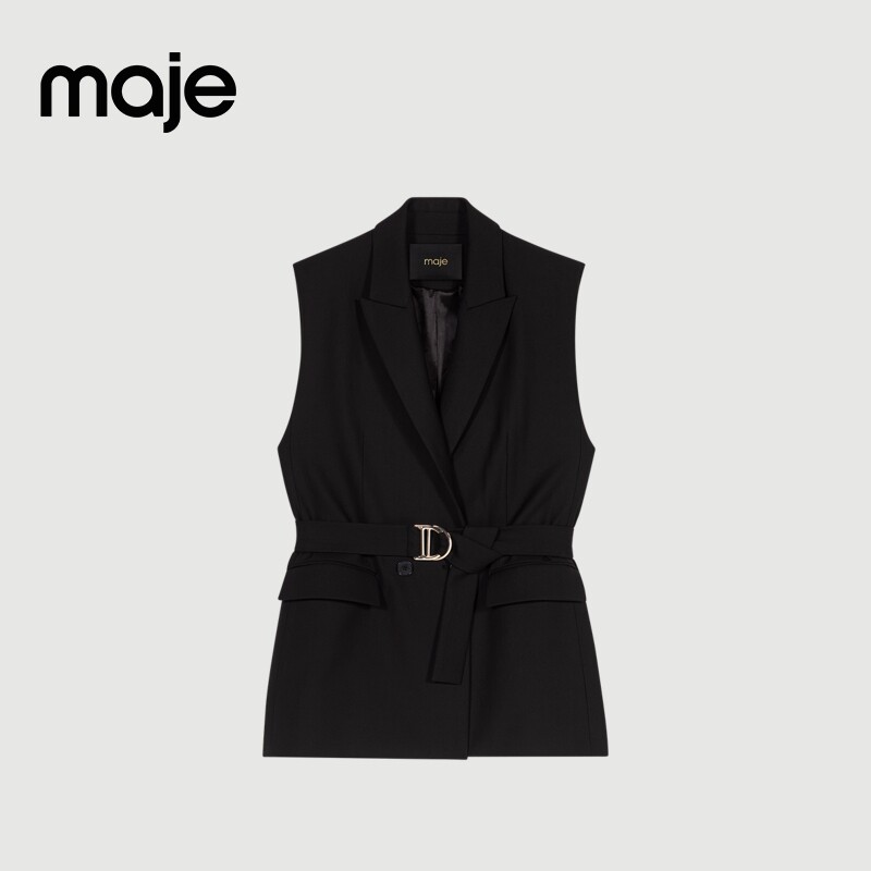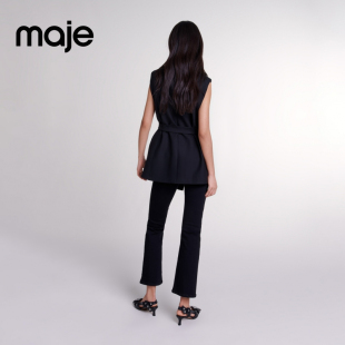 法式 时尚 黑色翻领无袖 Maje2025秋季 系带收腰西装 女装 短款 外套 新款