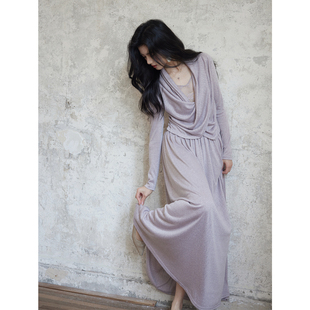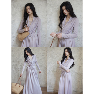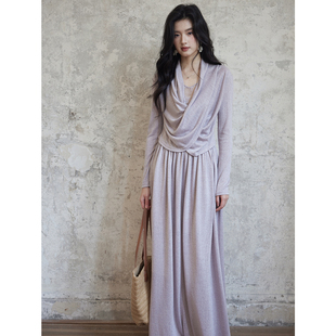 贰羊设计 交叉荡领蕾丝针织假两件连衣裙女气质设计感长裙 栀莜