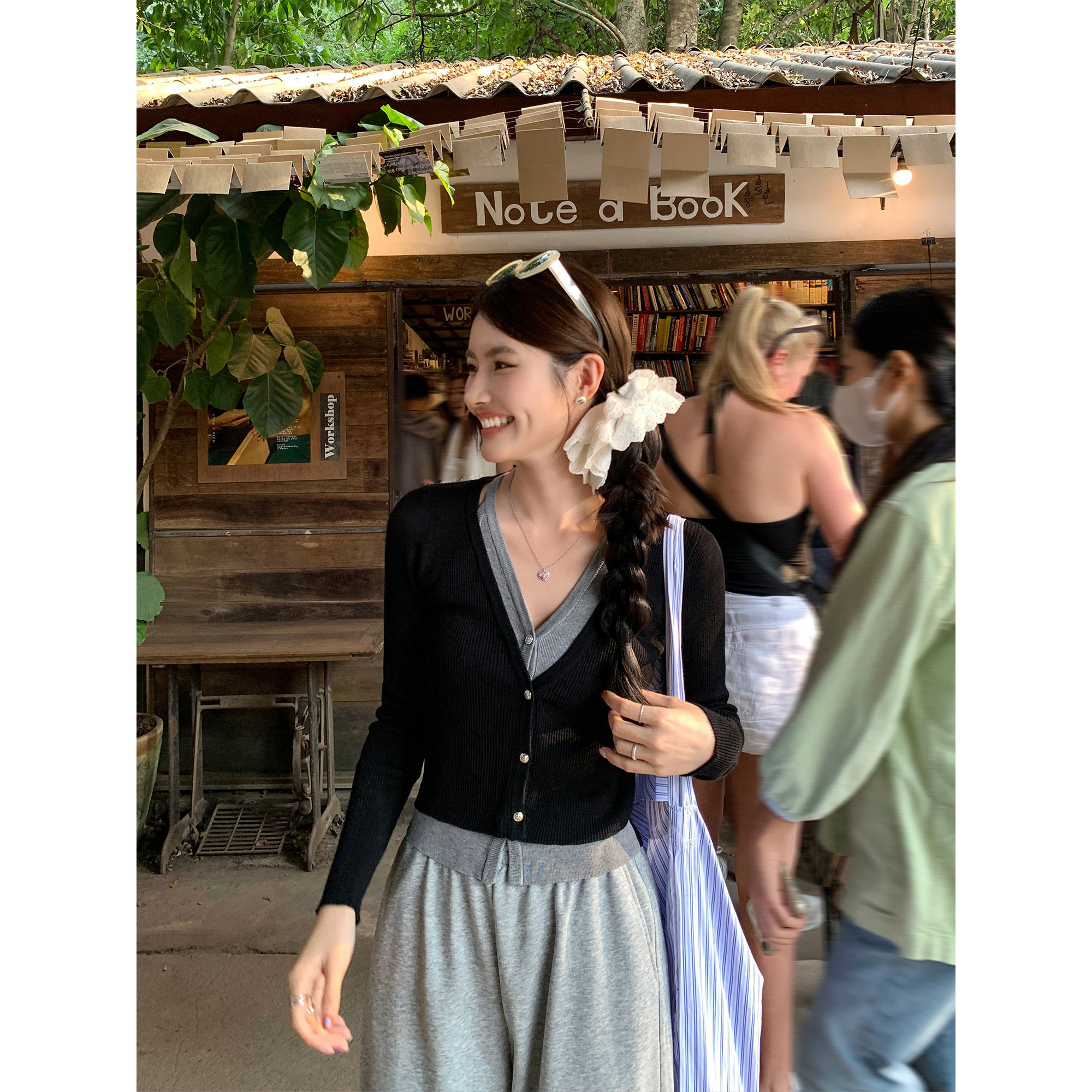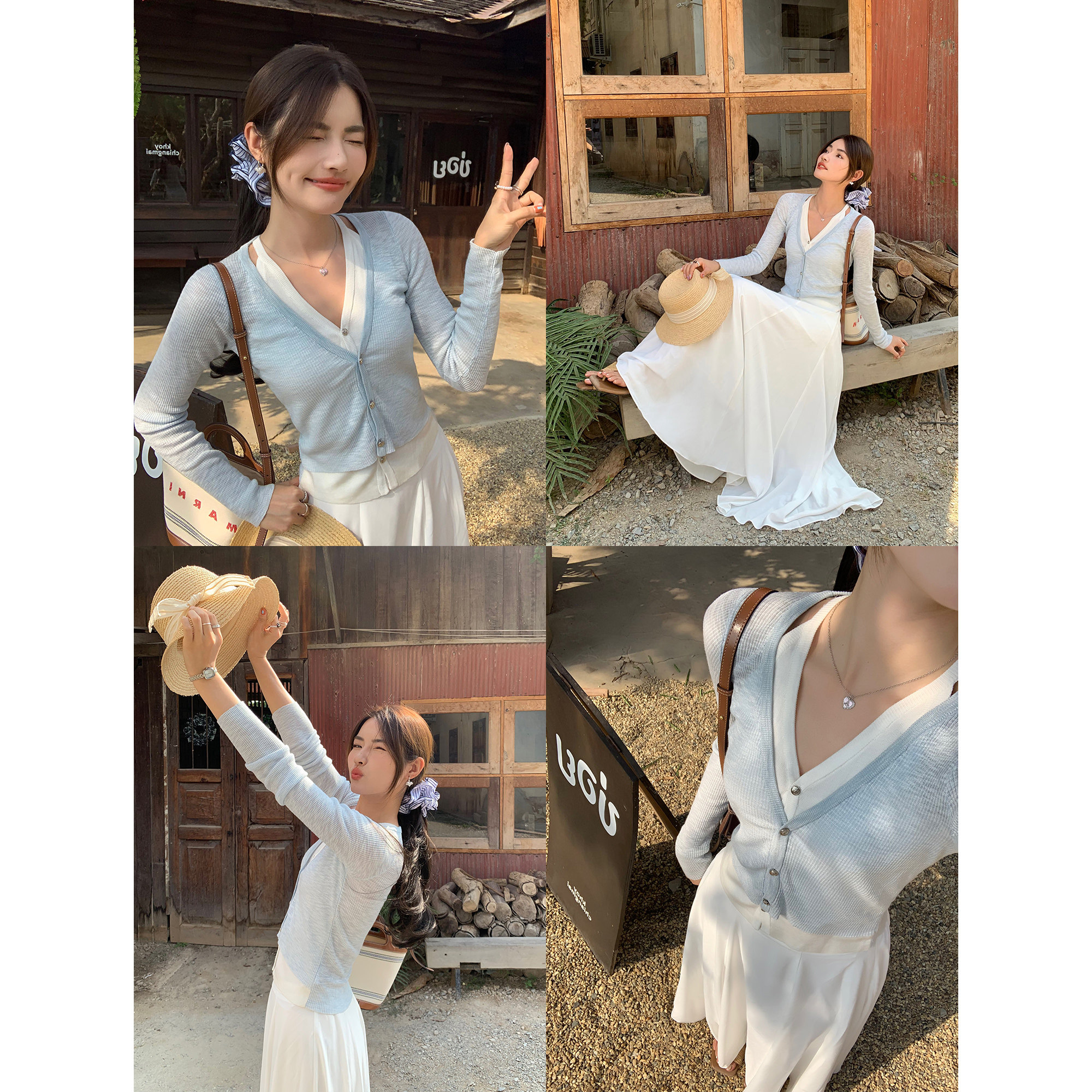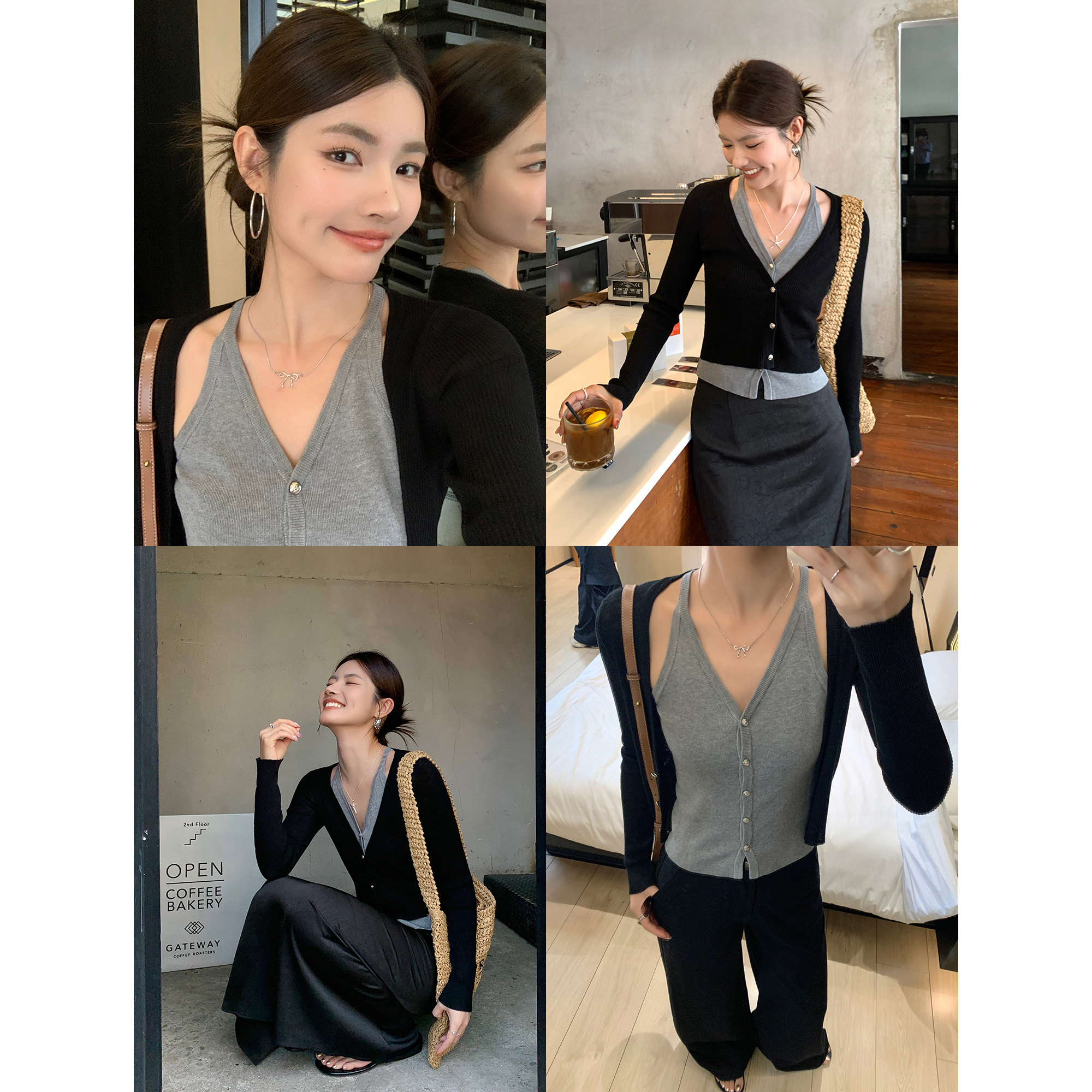 女小众撞色气质长袖 假两件v领针织开衫 上衣 现货5.5折 pusumede