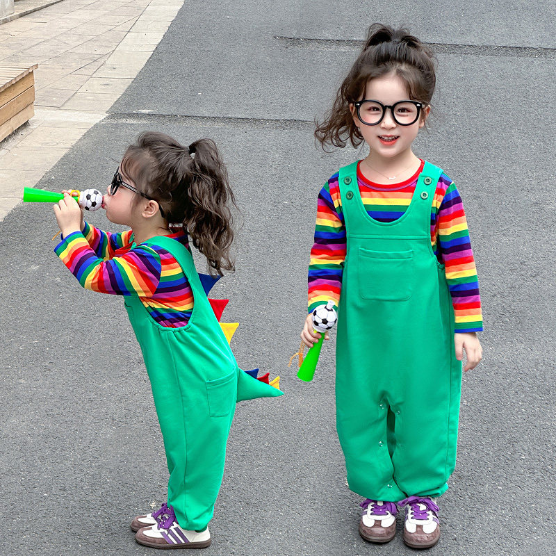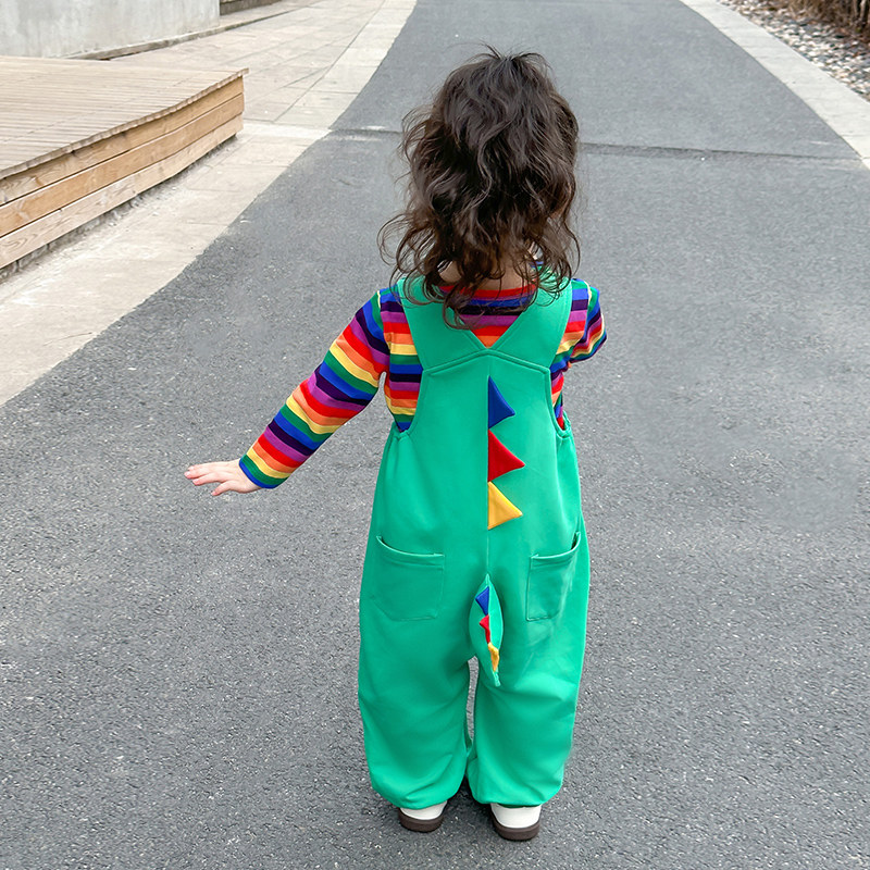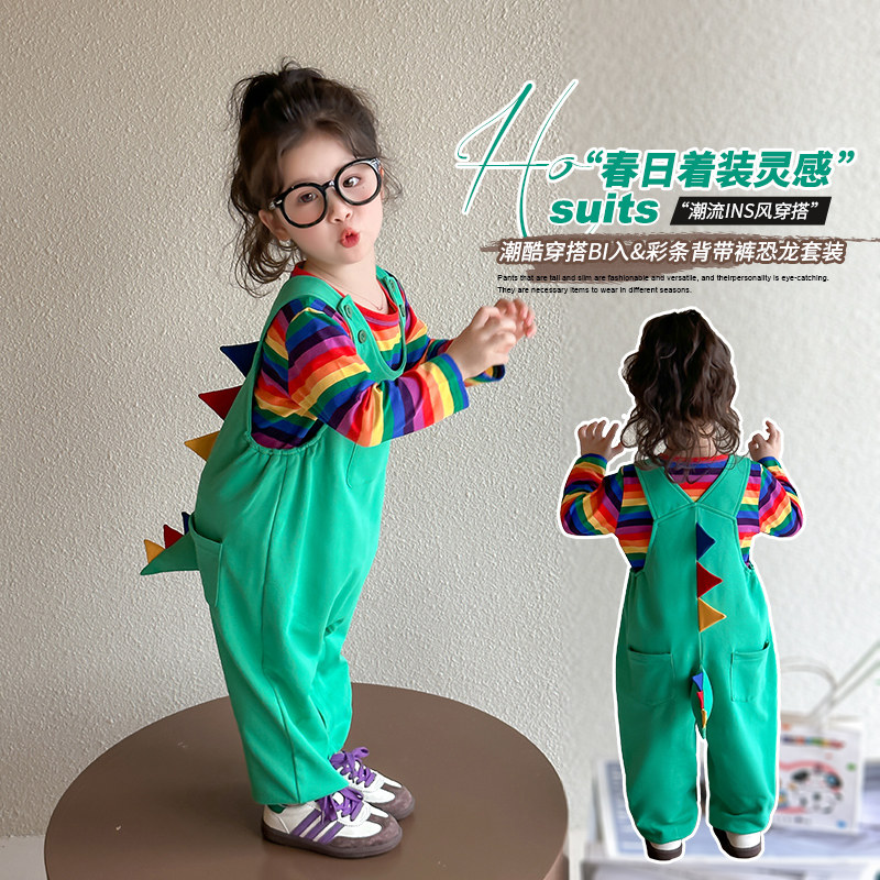 时髦3岁男女童秋装 1春秋纯棉2小恐龙衣服2025新款 套装 儿童背带裤