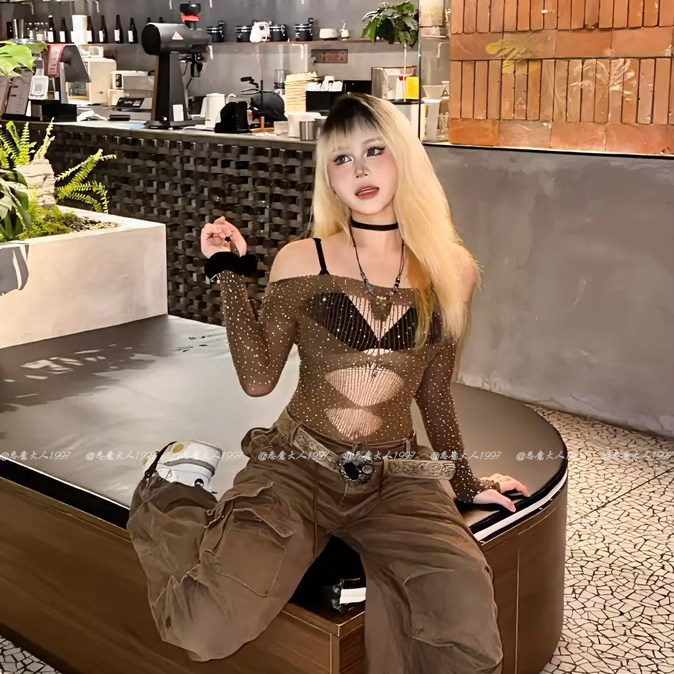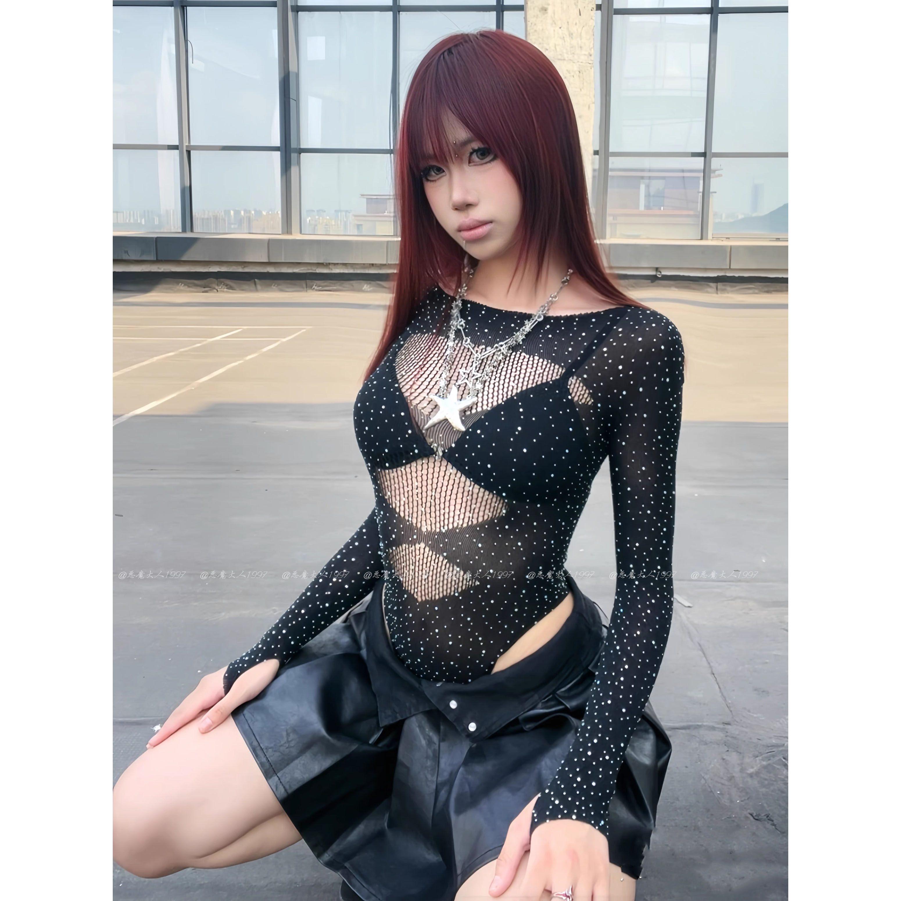恶魔大人性感辣妹镂空网眼烫钻上衣炸街透视外穿针织连体衣T恤女