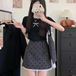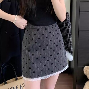 早秋蝴蝶结灰色短裙蕾丝边大码 高级感显瘦a字防走光半身裙子miu系