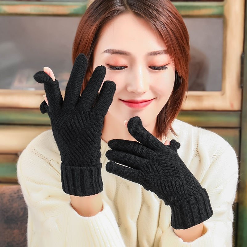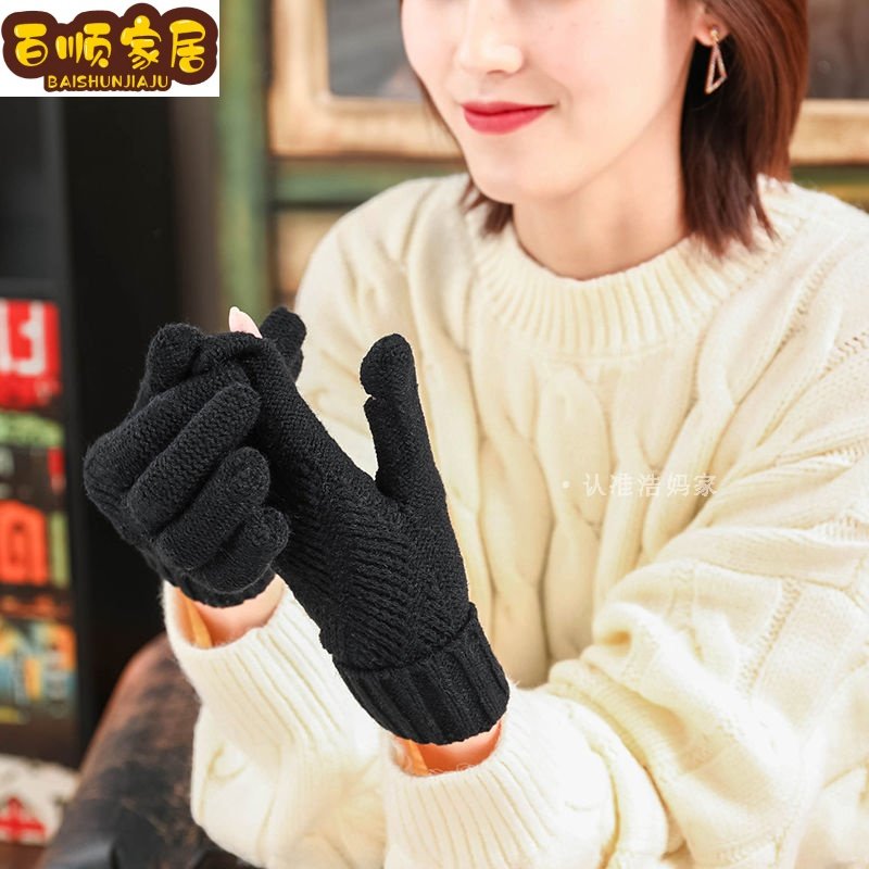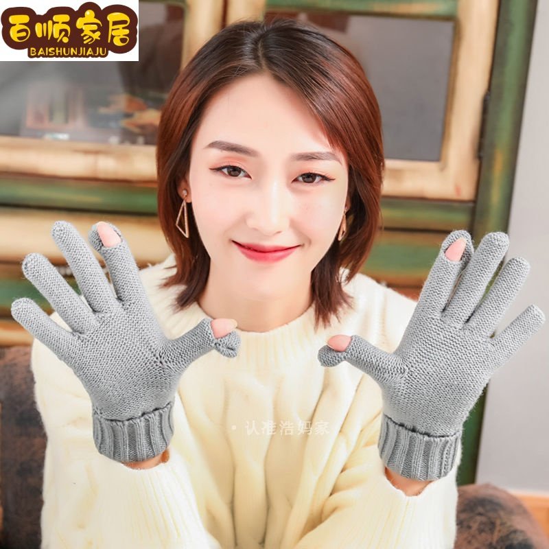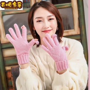 手套女士冬季 露指加厚保暖大童可爱学生防寒毛线分指触屏手套 新款