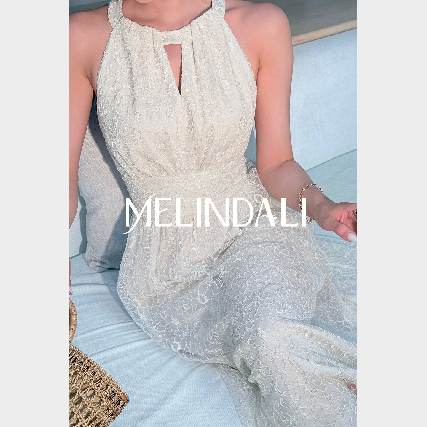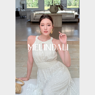 法式 天鹅梦露 优雅蕾丝亮片挂脖白色轻礼服连衣裙 MELINDA