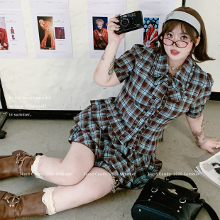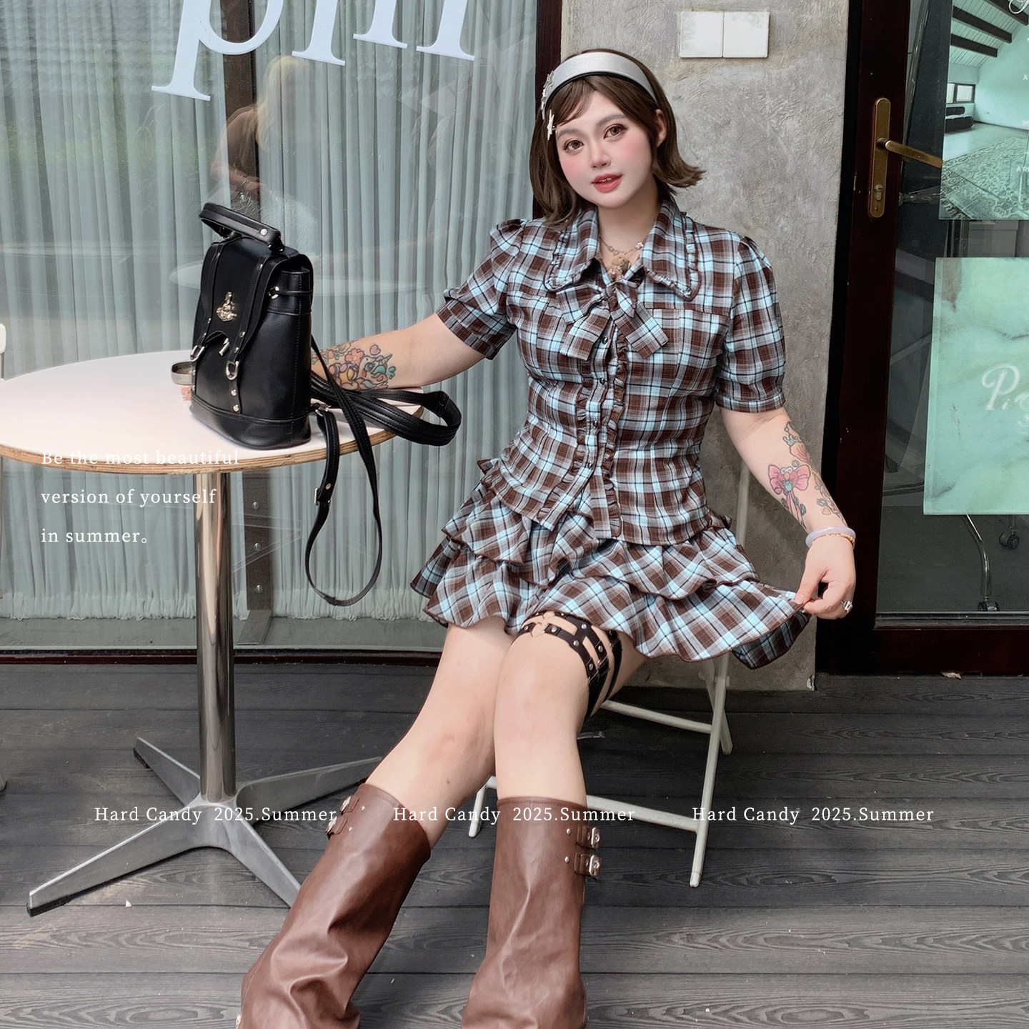 女胖mm花苞半裙套装 硬糖大码 收腰衬衫 辣妹格纹学院风短袖 原创美式